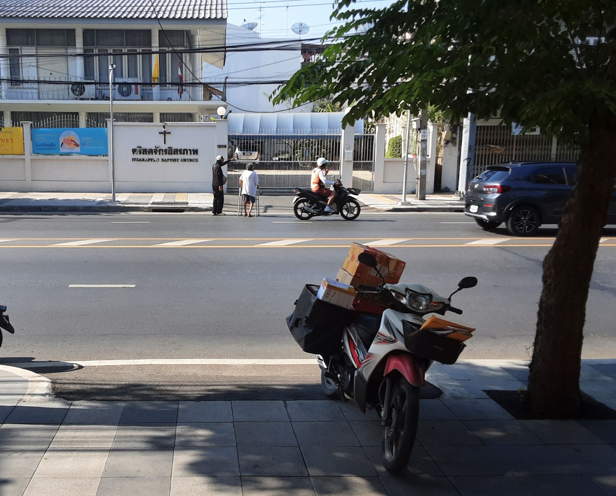 บุรุษไปรษณีย์ขาประจำแถวบ้าน เขารีบจอดรถ แล้วลงมาช่วยโบกกันรถที่วิ่งไปมา ให้ป้าค่อยๆเดินข้ามถนน