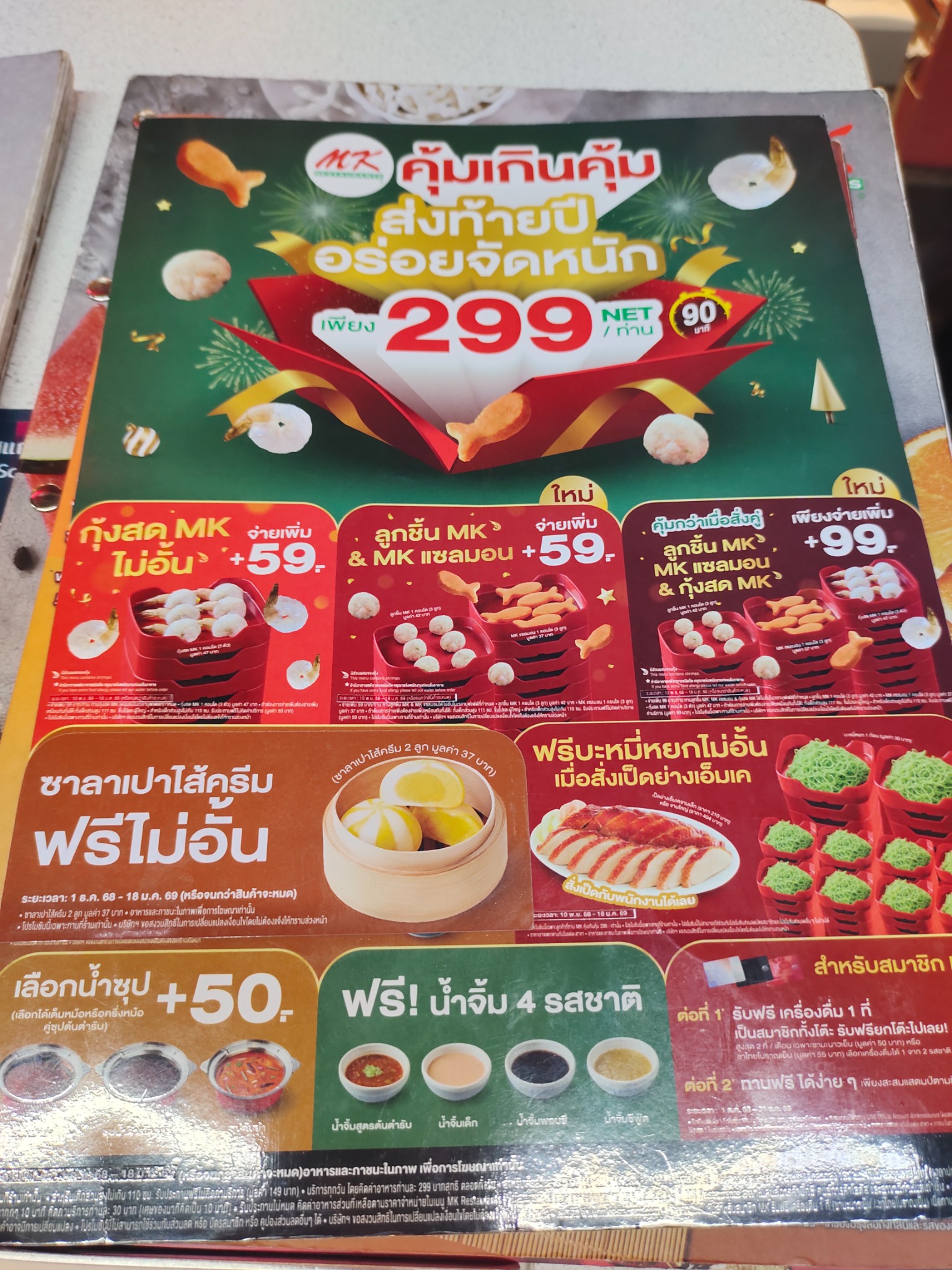 - ลูกชิ้น MK & Mk แซลมอน & กุ้งสด MK ไม่อั้น จ่ายเพิ่ม 99 บาท/ท่าน ตั้งแต่ 10 พ.ย. 2568 - 18 ม.ค.69