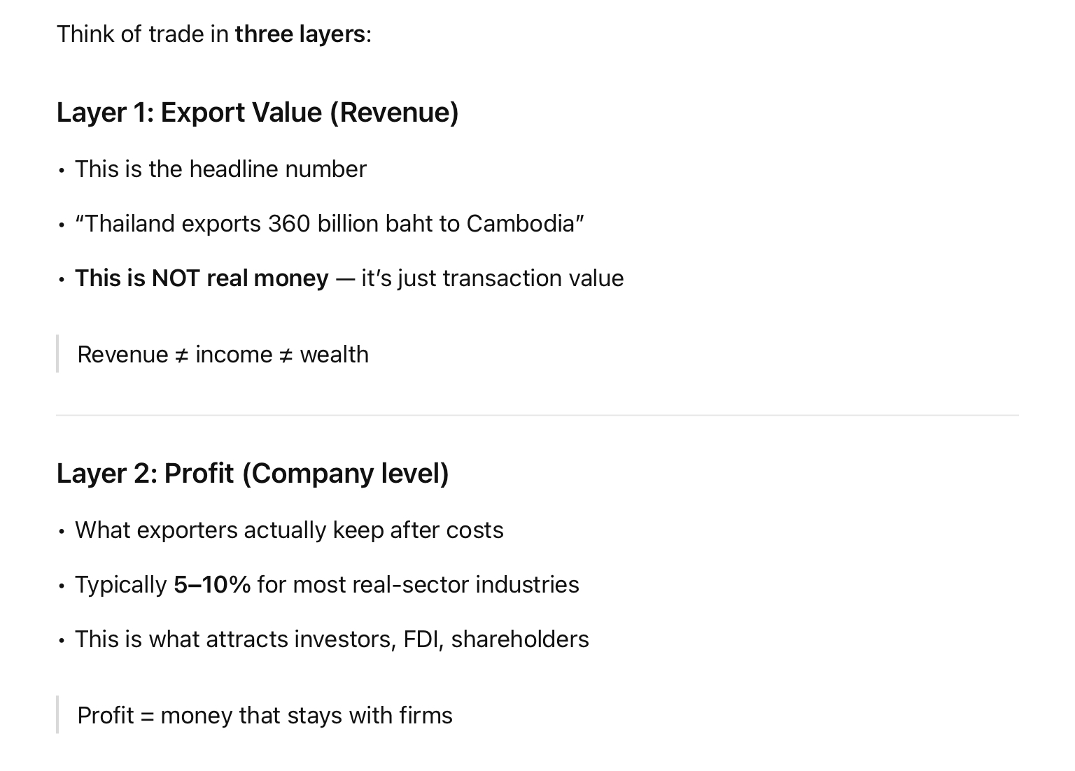 1. Layer 1: มูลค่าการส่งออก เป็น revenue รายรับ ไม่ได้บอกถึง มูลค่าอะไร (นักการเมือง เจ้าหน้าที่... หอการค้า เอามาเคลมผลงาน พาดหัวข่าว)
