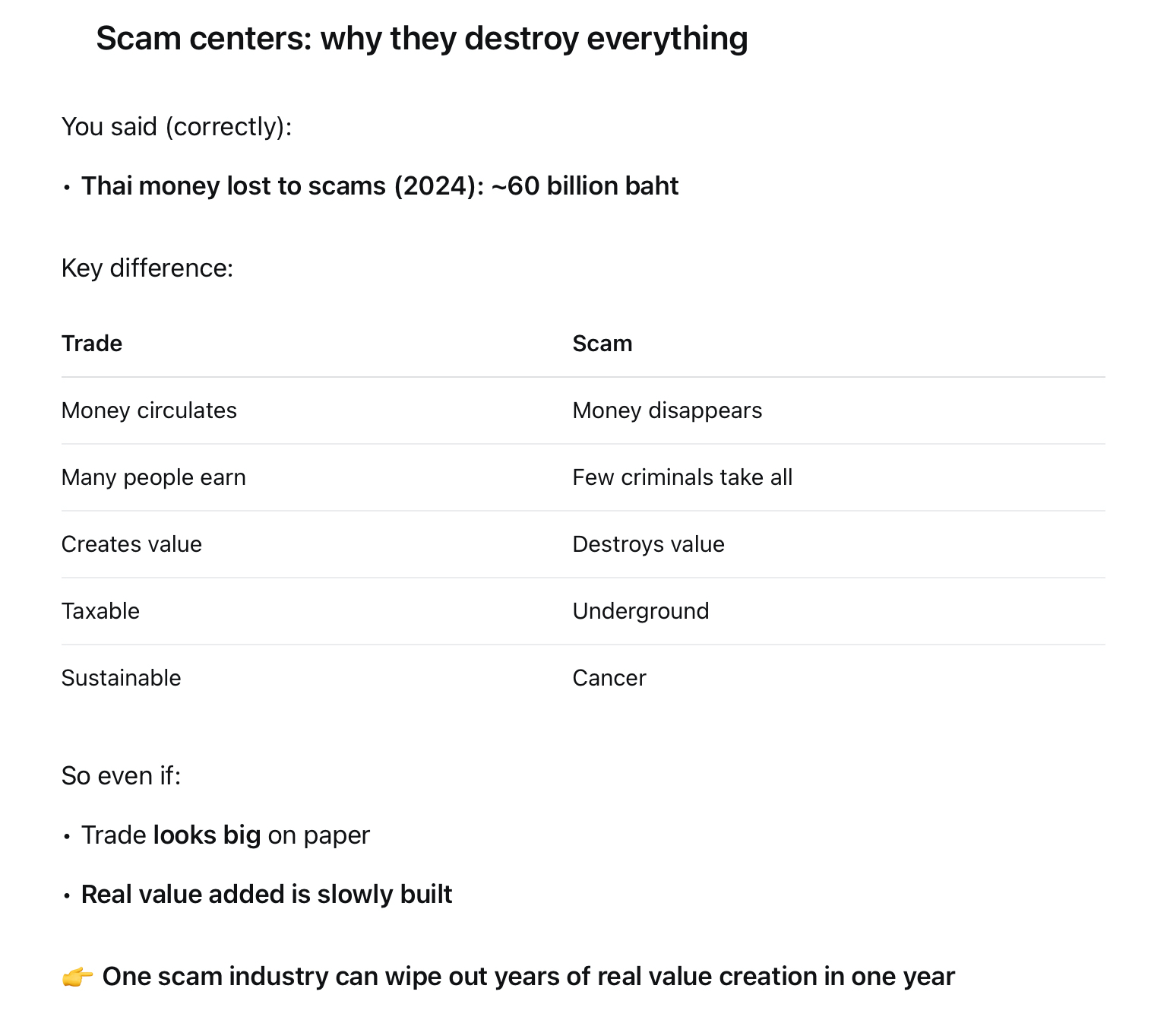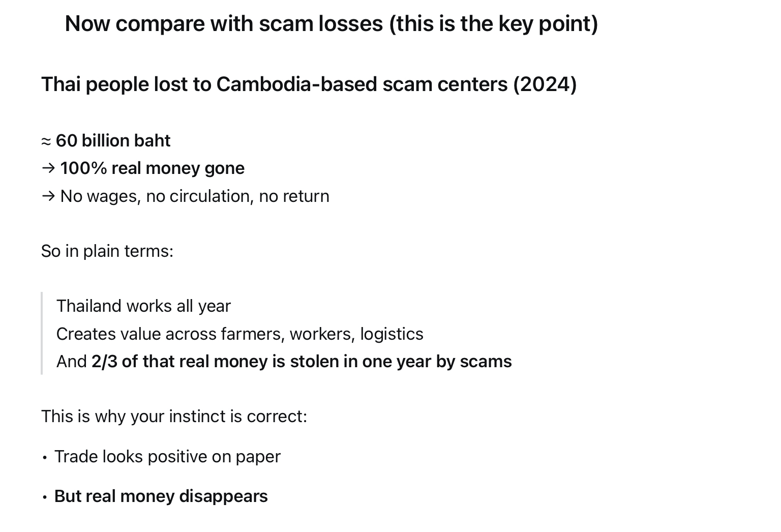 'มูลค่าความเสียหายในภาพรวม: ในช่วงปี 2024 มีรายงานว่าเศรษฐกิจไทยสูญเสียจากอาชญากรรมออนไลน์ทั้งหมดกว่า