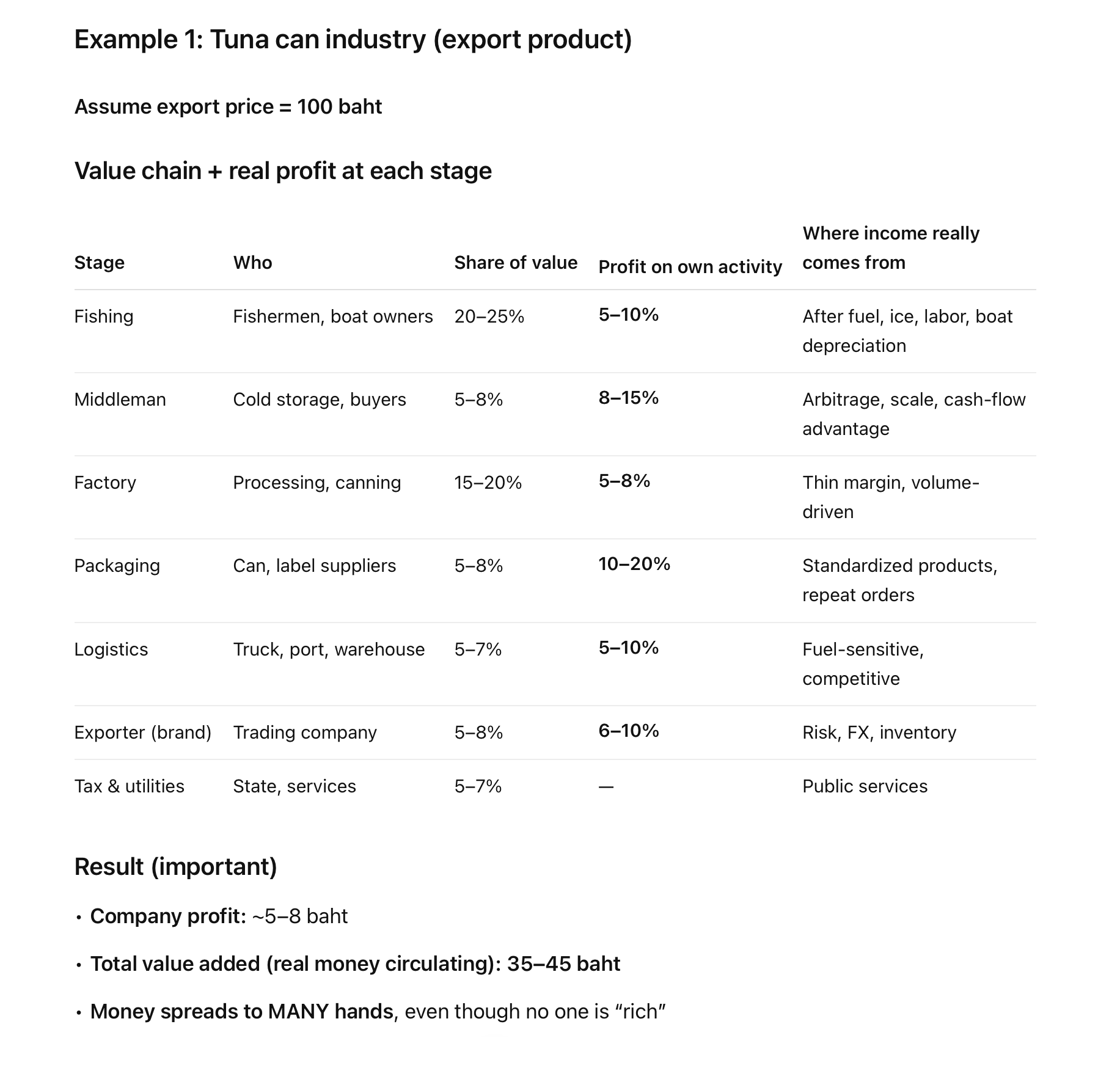 3. Layer 3: value added คือ เงินจริง ที่หมุนเวียนในสังคม บริษัท ส่งออกปลากระป๋อง บะหมี่สำเร็จรูป รายงานผลประกอบการ เห็นเป็นตัวเลขกำไร ...% แต่ในชีวิตจริง เงินที่หมุนเวียนลงไปอีก บริษัท logistic ได้กำไรไป ...% trader ได้ไป ...% โรงงานผลิต ...% พ่อค้าคนกลาง ...% เรือประมงหาปลา ชาวนาปลูกข้าว ...%