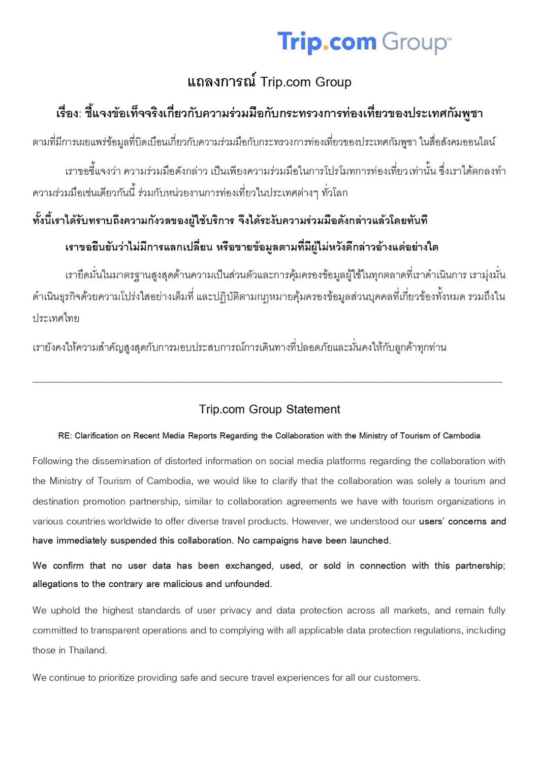 แถลงการณ์ Trip.com กรณีลงนามร่วมกับ “กัมพูชา”
