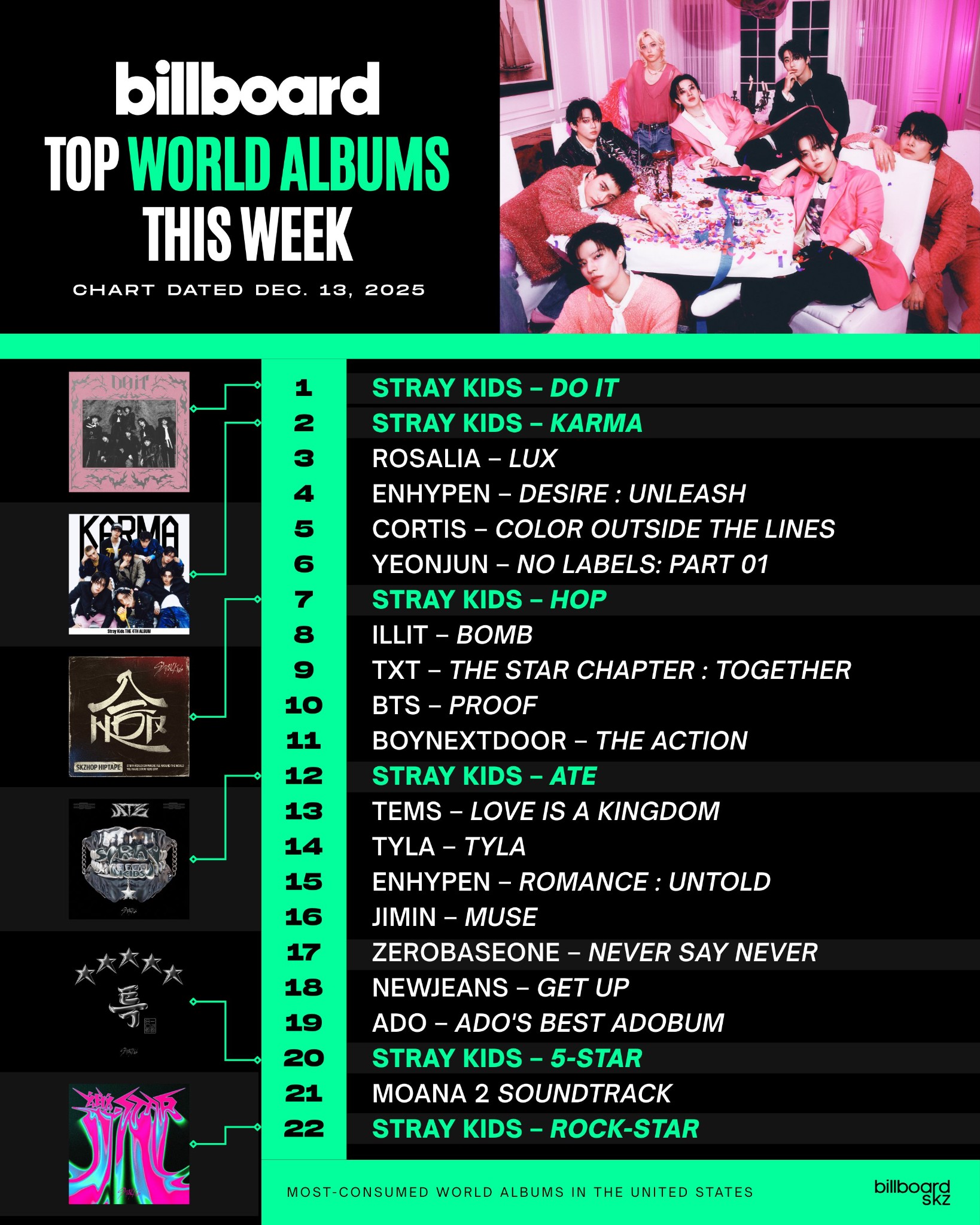 🔥 Stray Kids "KARMA" เดบิวท์ที่อันดับ 1 บน Billboard World Albums (dated Sept. 6, 2025) - Stray Kids เป็นศิลปิน K-pop ที่มีจำนวนอัลบั้มติดชาร์ต Billboard World Albums พร้อมกันสูงสุด โดยทำได