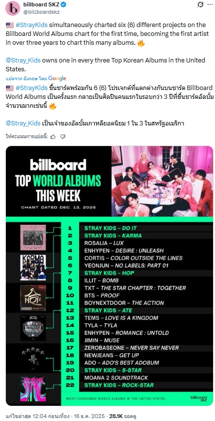 🔥 Stray Kids เป็นศิลปิน K-pop ที่มีอัลบั้มติดชาร์ต Billboard World Albums สูงสุดโดยมีอัลบั้ม 4 อัลบั้มในสัปดาห์ล่าสุด
