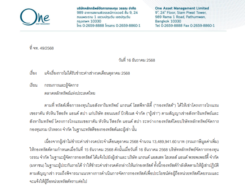 GAHREIT แจ้งเรื่องการไม่ได้รับชำระค่าเช่างวดเดือนตุลาคม 2568