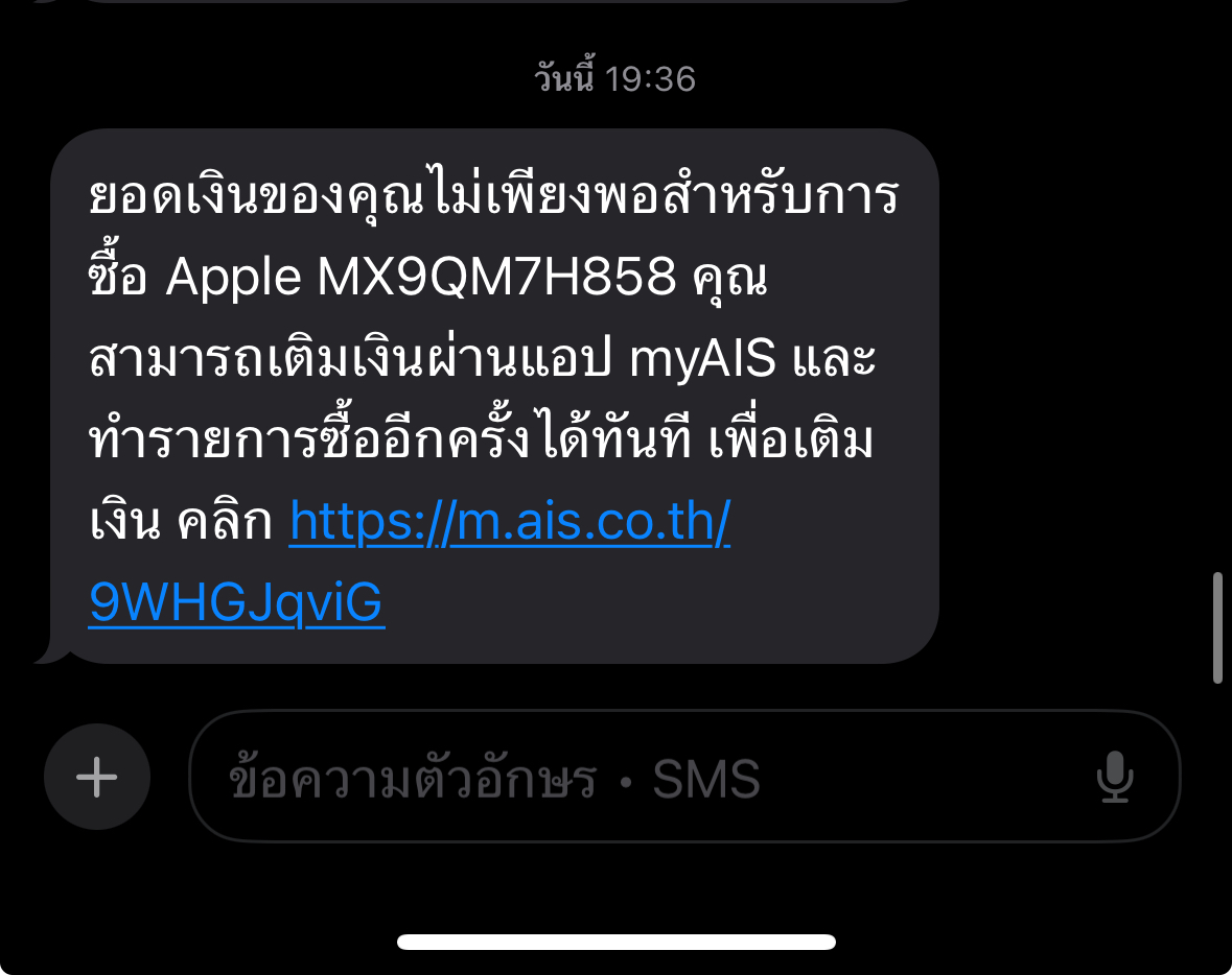มี sms ส่งว่ายอดเงินไม่เพียงพอสำหรับการซื้อ Apple MM9M6W1HXQ เช็คในมือถือก็ไม่ได้สมัครอะไรค้างไว้ จะโหลดแอพอะไรไม่ได้เลย ขึ้นแต่ให้ใส่รหัส