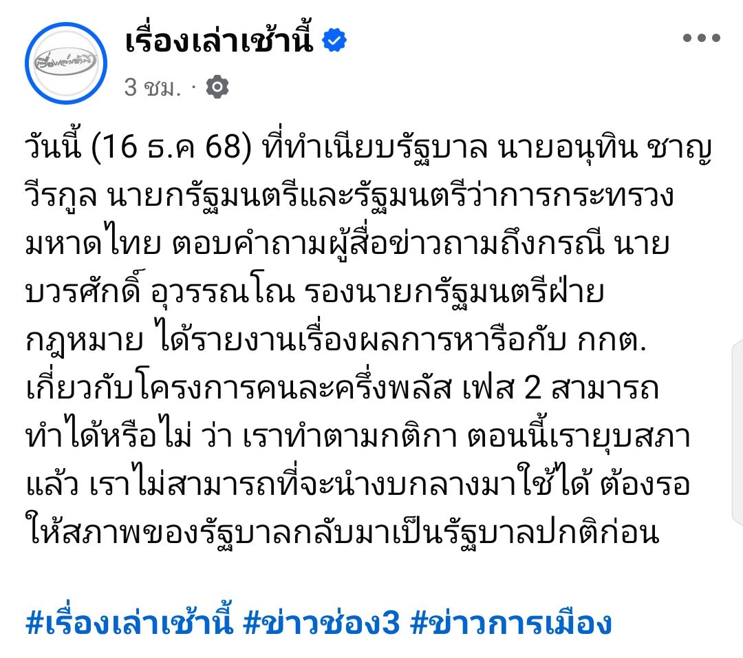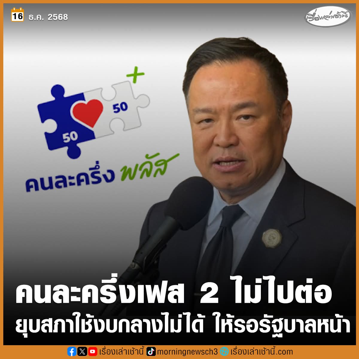 โครงการ "คนละครึ่งพลัส เฟส 2" ยุติชั่วคราว หลังยุบสภา หลังจากที่นายอนุทิน ชาญวีรกูล นายกรัฐมนตรี ได้กราบบังคมทูลยุบสภาผู้แทนราษฎรเมื่อค่ำวันที่ 11 ธันวาคม 2568 เพื่อเปิดทางสู่การเลือกตั้ง