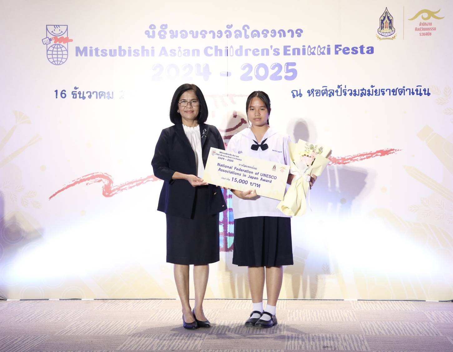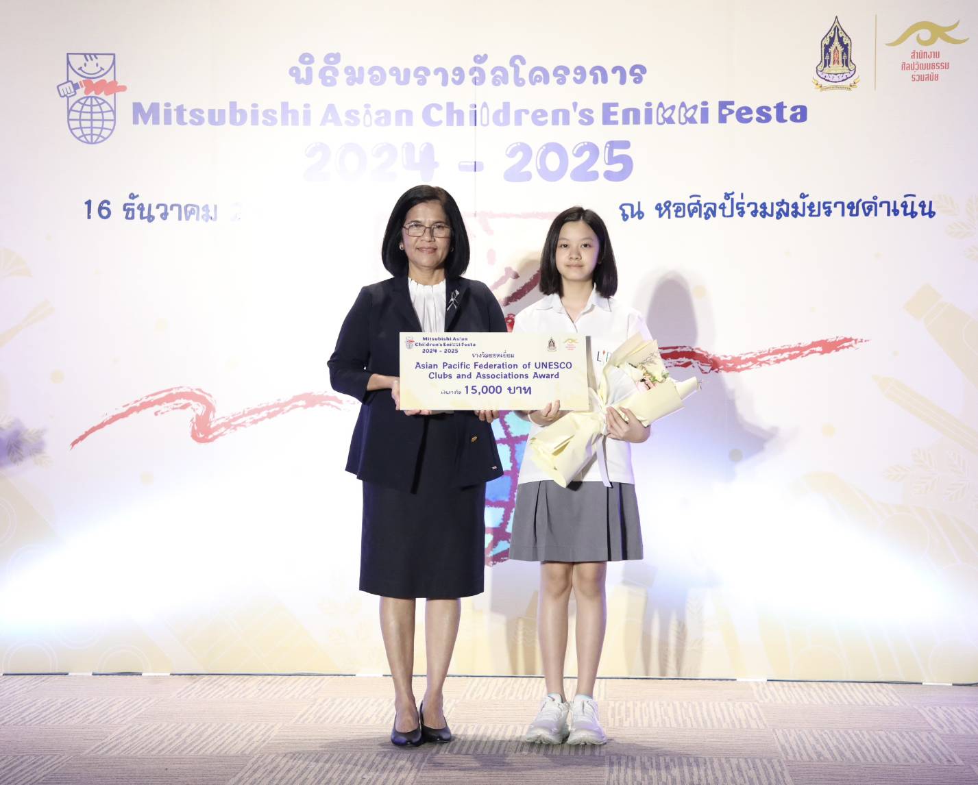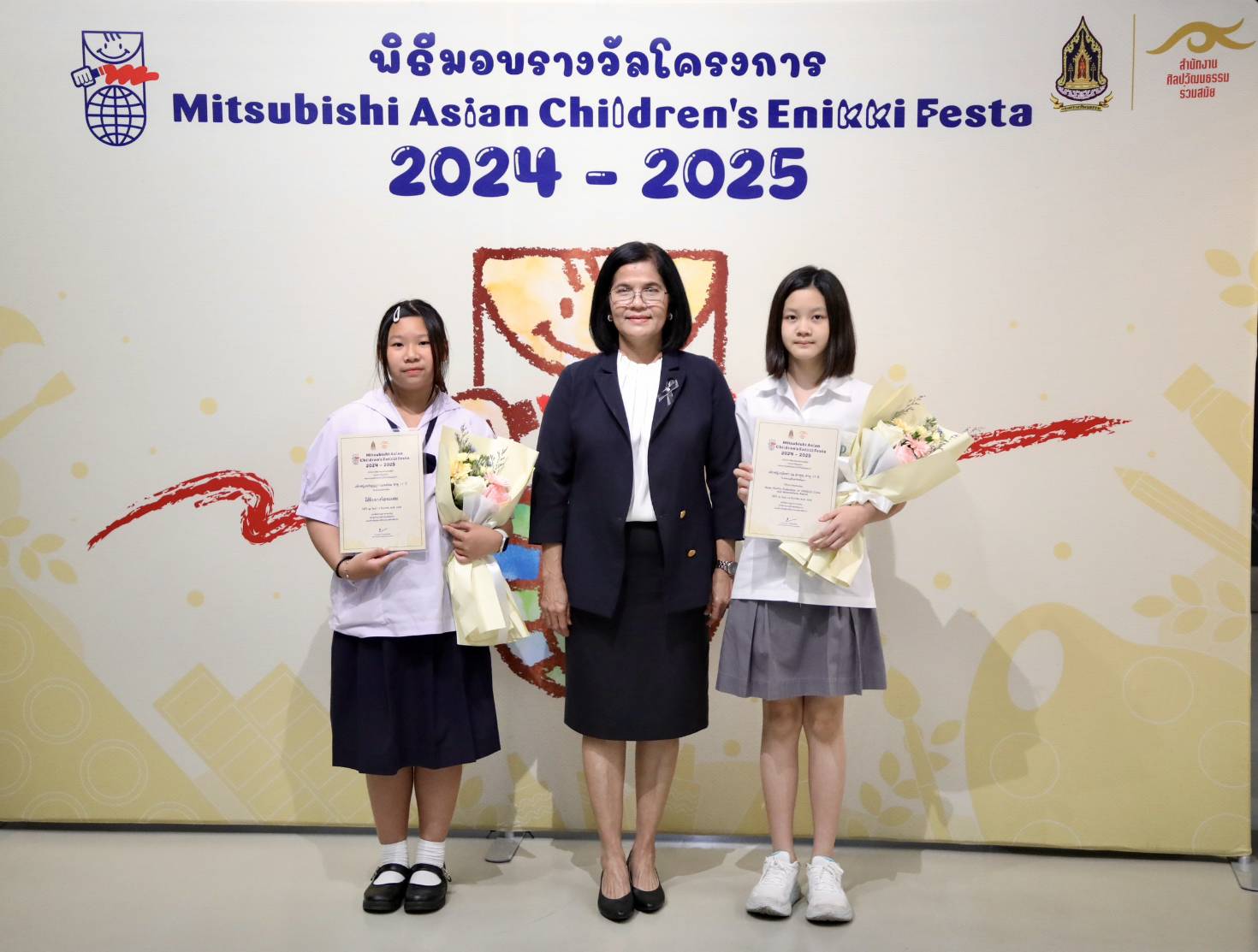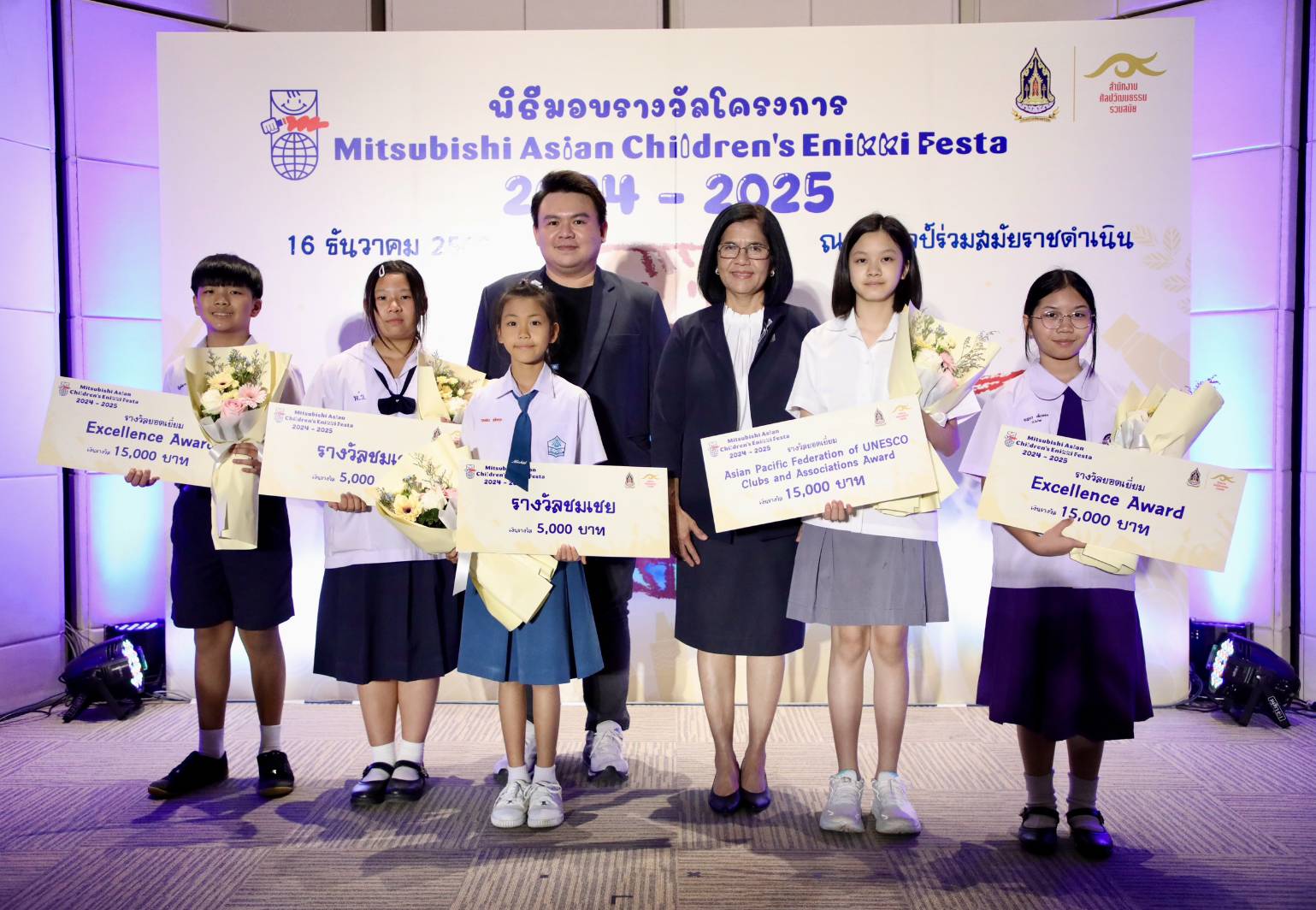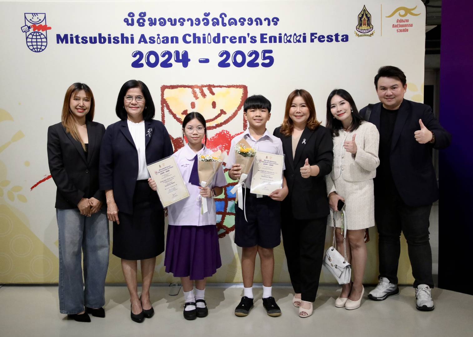 ทั้งนี้ สำนักงานศิลปวัฒนธรรมร่วมสมัย (สศร.) กระทรวงวัฒนธรรม (วธ.) จัด “โครงการ Mitsubishi Asian Children’s Enikki Festa 2024 – 2025” โดยได้รับการสนับสนุนงบประมาณดำเนินโครงการจาก National Federation of UNESCO Association in Japan (NFUAJ) เพื่อส่งเสริมให้เด็กอายุ 6-12 ปี ได้พัฒนาศักยภาพ สร้างสรรค์ผลงานศิลปะ ส่งเสริมความรักการอ่านและเขียน เผยแพร่ผลงานศิลปะและแลกเปลี่ยนเรียนรู้ศิลปวัฒนธรรมระหว่างประเทศ ซึ่งโครงการฯ ได้เปิดรับผลงานศิลปะจากเด็กที่มีอายุระหว่าง 6 -12 ปี จากทั่วประเทศ ในหัวข้อ “ชีวิตของฉันที่อยากจะแบ่งปันกับทุกคนในเอเชีย” โดยมีเด็กส่งผลงานเข้าร่วมโครงการฯ ทั้งหมด 693 คน จำนวน 2,079 ผลงาน ซึ่งคณะกรรมการคัดเลือกและตัดสินผลงานได้ตัดสินผลงานยอดเยี่ยมระดับประเทศ 8 รางวัล และรางวัลชมเชยระดับประเทศอีก 10 รางวัล รวมทั้งสิ้น 18 รางวัล