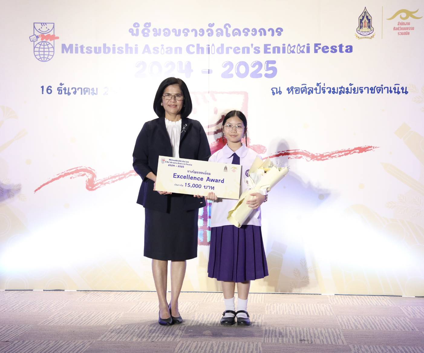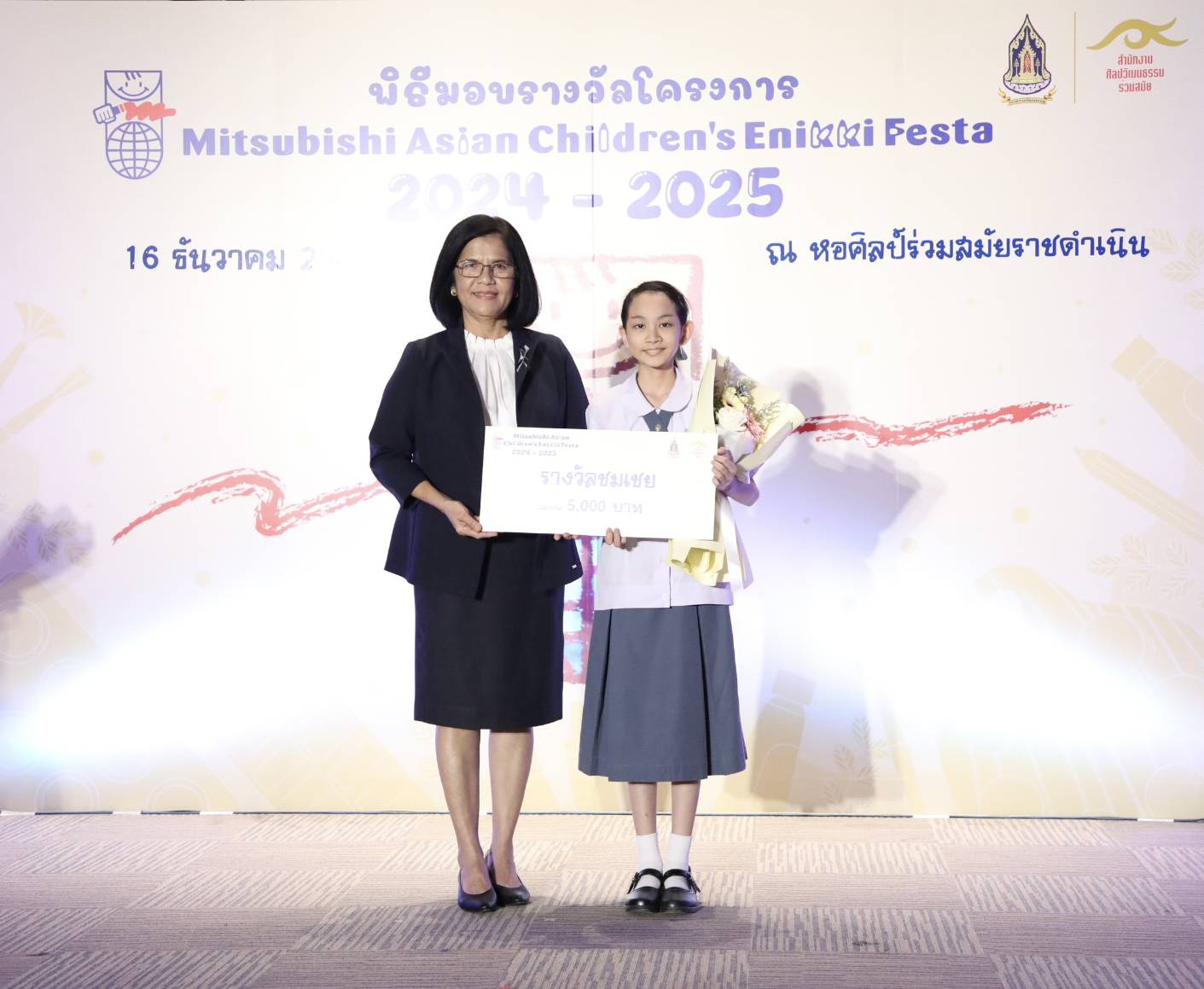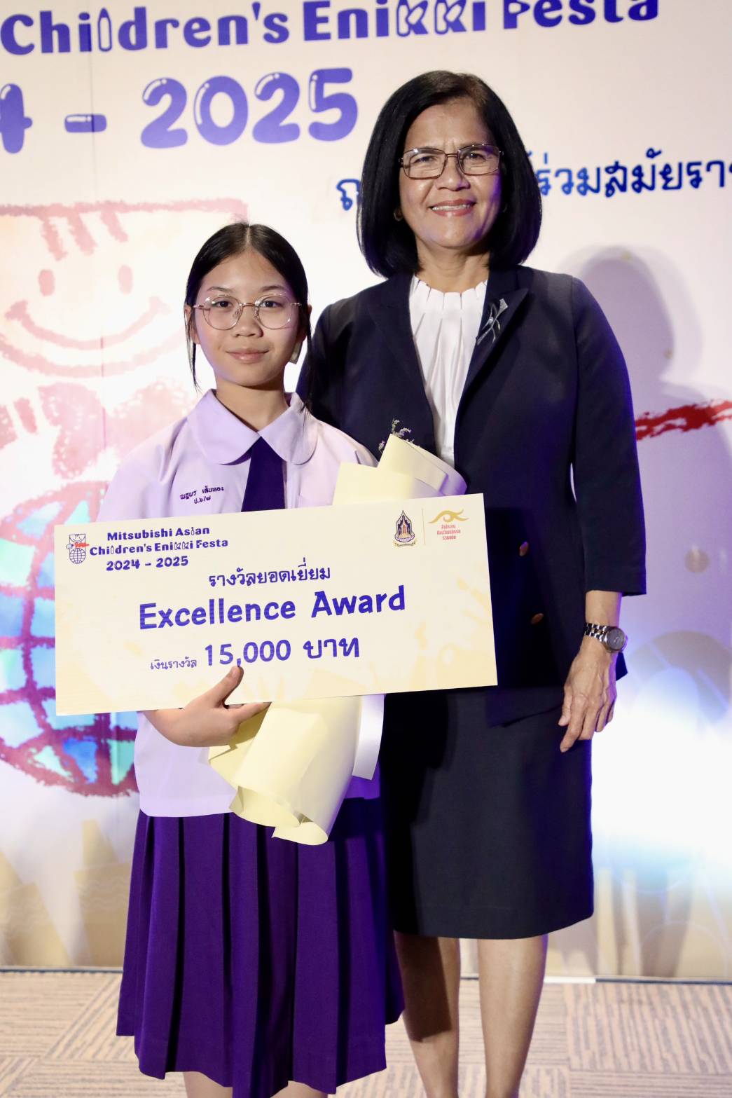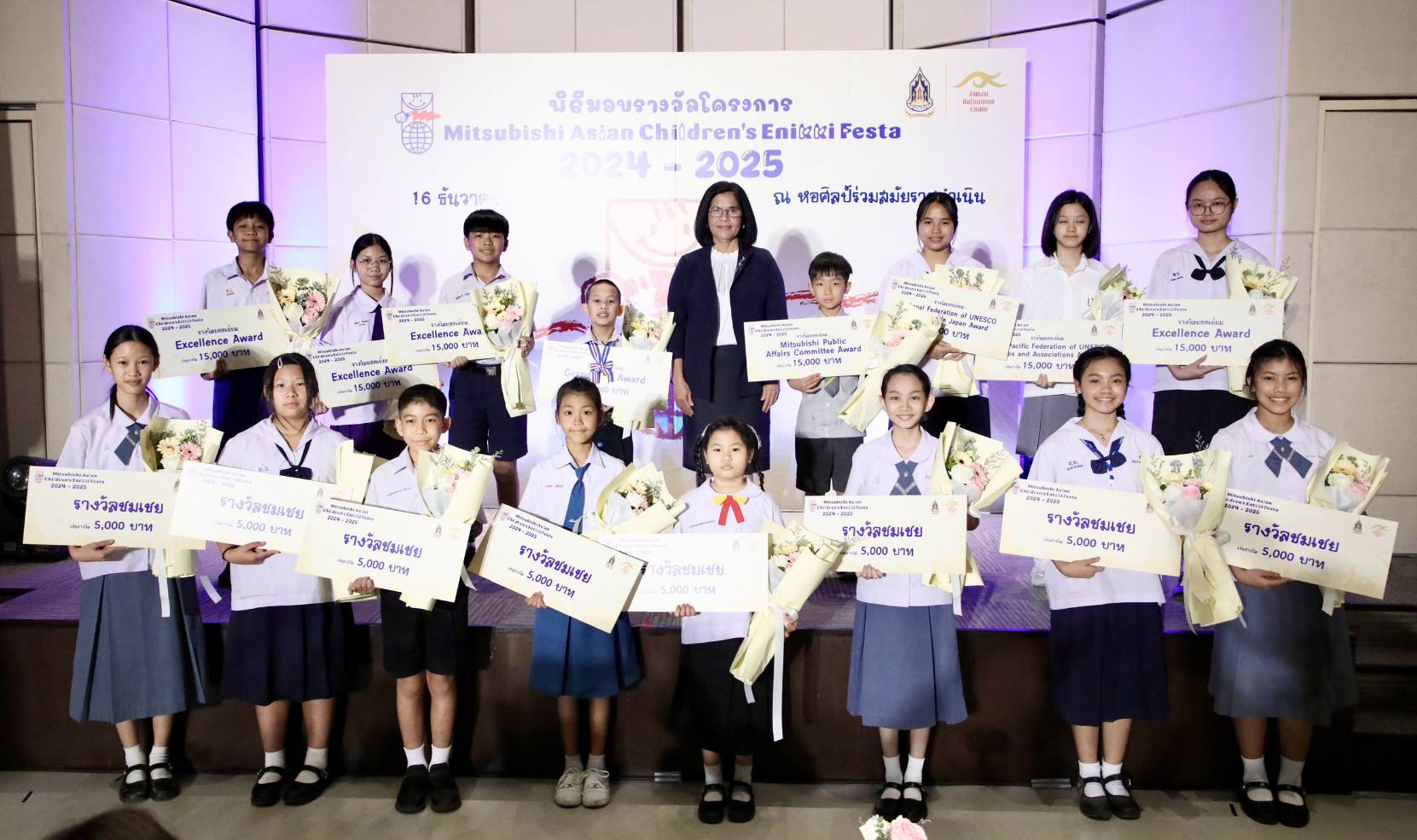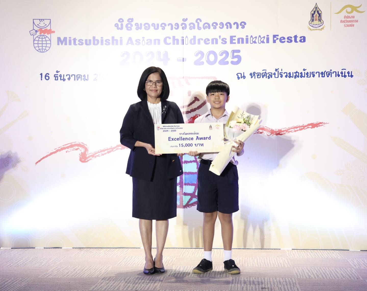 ทั้งนี้ สำนักงานศิลปวัฒนธรรมร่วมสมัย (สศร.) กระทรวงวัฒนธรรม (วธ.) จัด “โครงการ Mitsubishi Asian Children’s Enikki Festa 2024 – 2025” โดยได้รับการสนับสนุนงบประมาณดำเนินโครงการจาก National Federation of UNESCO Association in Japan (NFUAJ) เพื่อส่งเสริมให้เด็กอายุ 6-12 ปี ได้พัฒนาศักยภาพ สร้างสรรค์ผลงานศิลปะ ส่งเสริมความรักการอ่านและเขียน เผยแพร่ผลงานศิลปะและแลกเปลี่ยนเรียนรู้ศิลปวัฒนธรรมระหว่างประเทศ ซึ่งโครงการฯ ได้เปิดรับผลงานศิลปะจากเด็กที่มีอายุระหว่าง 6 -12 ปี จากทั่วประเทศ ในหัวข้อ “ชีวิตของฉันที่อยากจะแบ่งปันกับทุกคนในเอเชีย” โดยมีเด็กส่งผลงานเข้าร่วมโครงการฯ ทั้งหมด 693 คน จำนวน 2,079 ผลงาน ซึ่งคณะกรรมการคัดเลือกและตัดสินผลงานได้ตัดสินผลงานยอดเยี่ยมระดับประเทศ 8 รางวัล และรางวัลชมเชยระดับประเทศอีก 10 รางวัล รวมทั้งสิ้น 18 รางวัล