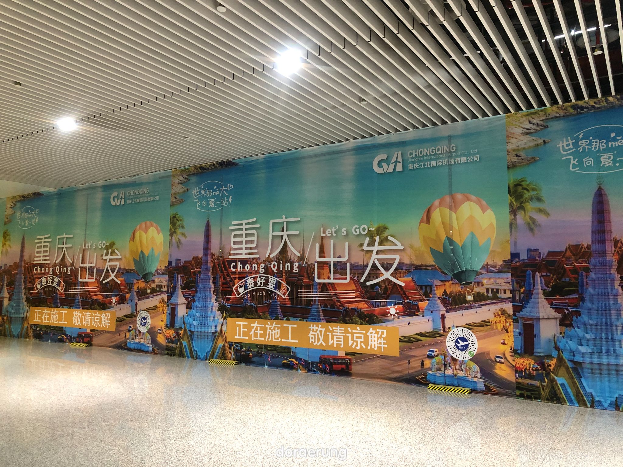 บินอยู่ข้างบน แดดจ้ามาก กัปตันชื่ออะไรจำไม่ได้แล้ว บินนิ่มมาก ... ถึงแล้วจ้า สนามบินฉงชิ่ง เจียงเป่ย หมอกจัดมาก จนนึกว่า PM2.5 ขณะที่เครื่องกำลังแท็กซี่จะเข้าจอด มีเสียงประกาศทั้งไทย อังกฤษ จีน ว่า อย่าเพิ่งลุกจากที่นั่ง ก็ยังมีคนจีนไม่สนสี่สนแปด ลุกขึ้นเปิดที่เก็บสัมภาระเตรียมจะลง จนแอร์ฯต้องเข้ามาดุ ดุแบบเสียงแข็งเลย (คิดในใจ สมน้ำหน้า ฮ่า ๆ ๆ)