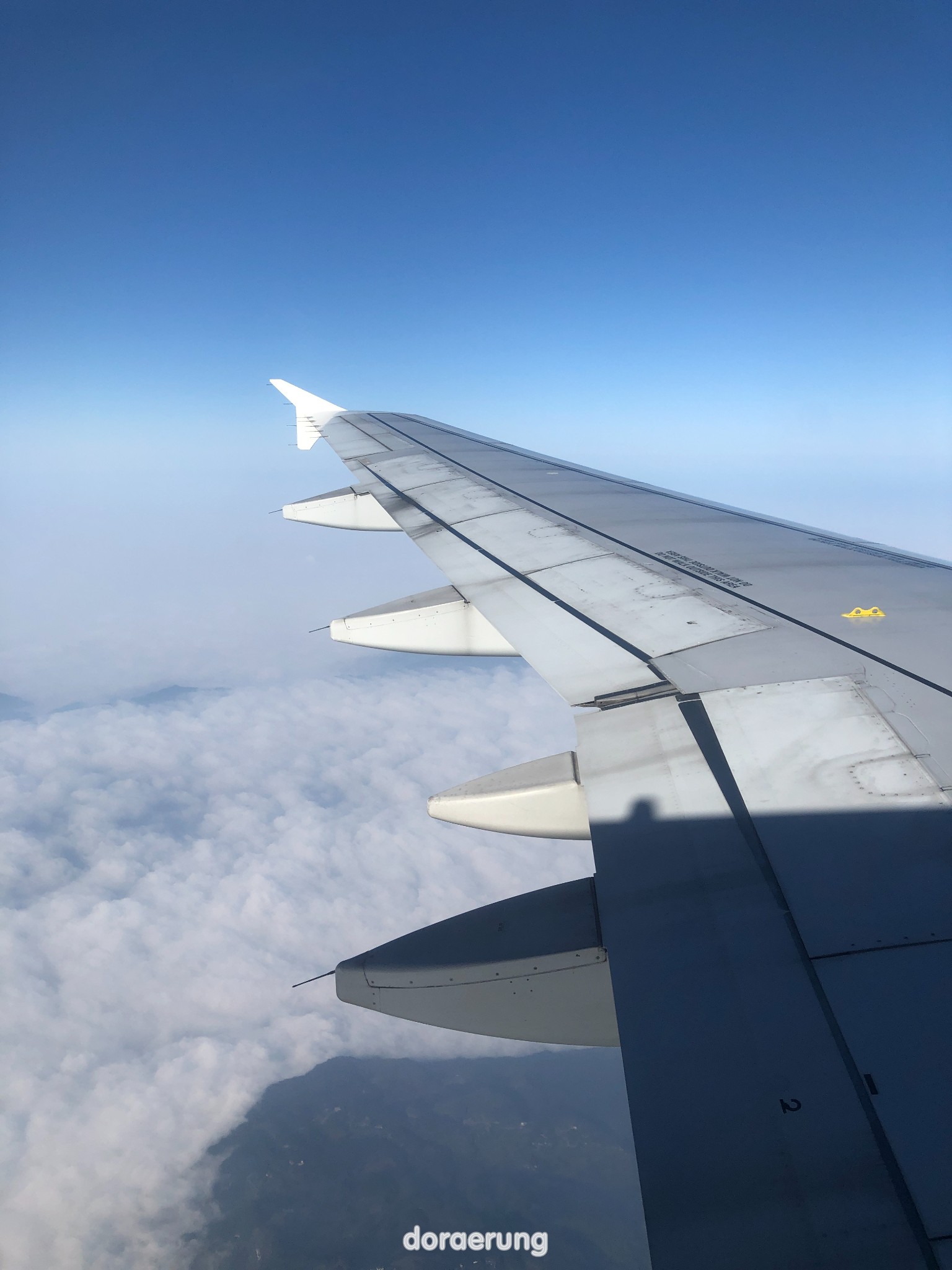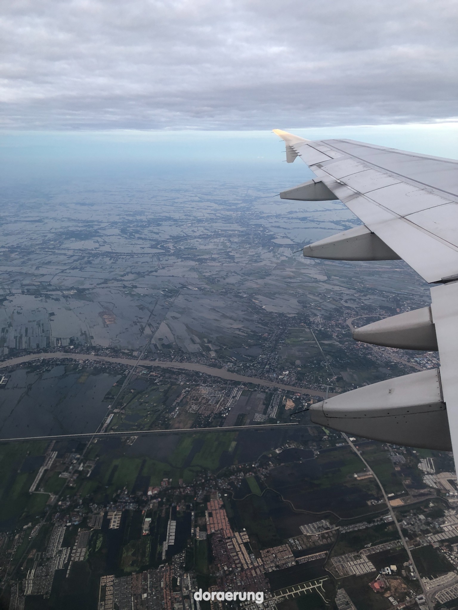 ได้ที่นั่งริมหน้าต่างค่ะ ตอนเข้าเก้าอี้ หัวโขกเพดานไป 1 กรุบ ฮ่า ๆ ๆ ระหว่างบินส่องดูข้างล่าง มันมองไม่ชัดอะ ดู ๆ ก็เหมือนเป็นพื้นที่น้ำท่วมภาคกลาง เพราะ จ.อยุธยา 4 เดือนแล้ว น้ำยังไม่ลด แต่อาจจะไม่ใช่ก็ได้ เดา ๆ อะเนาะ