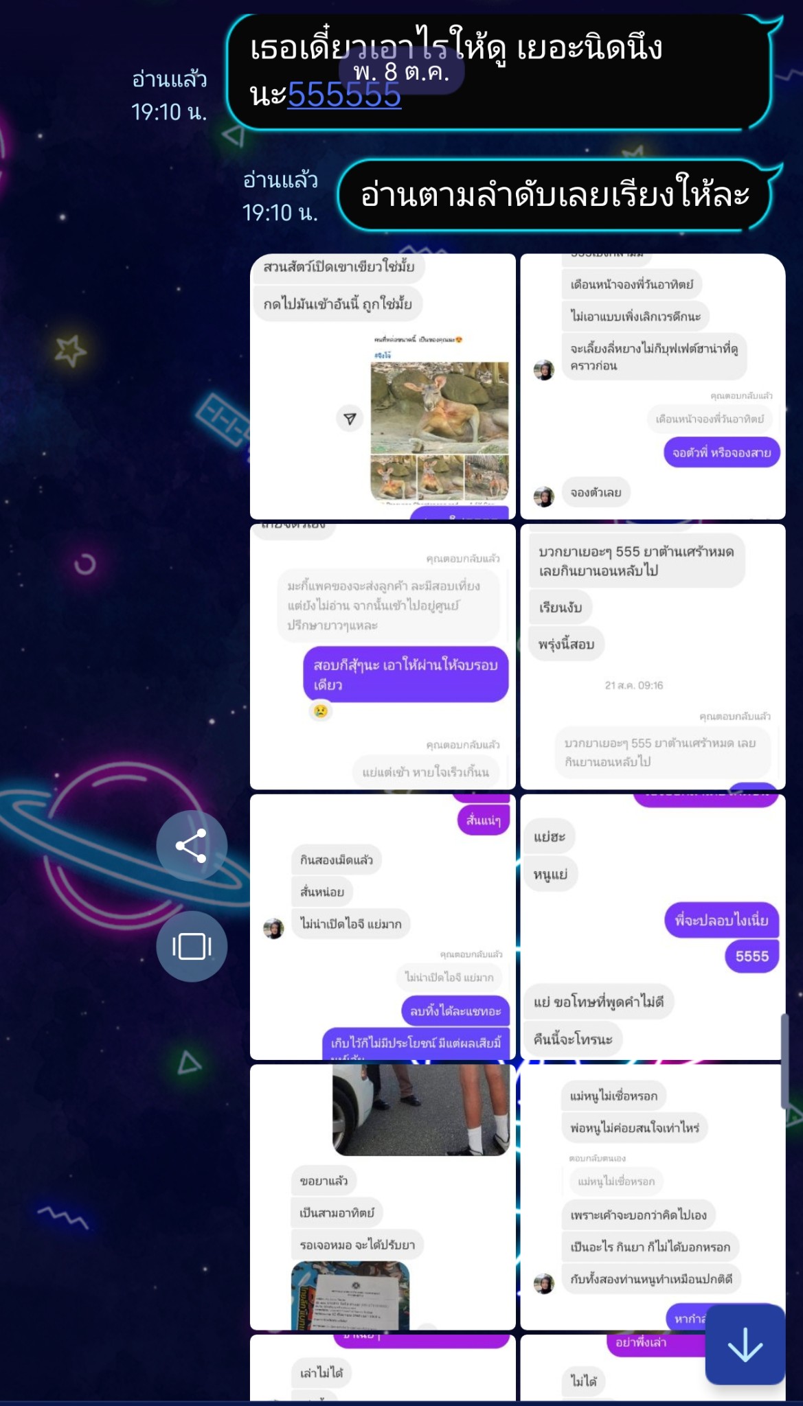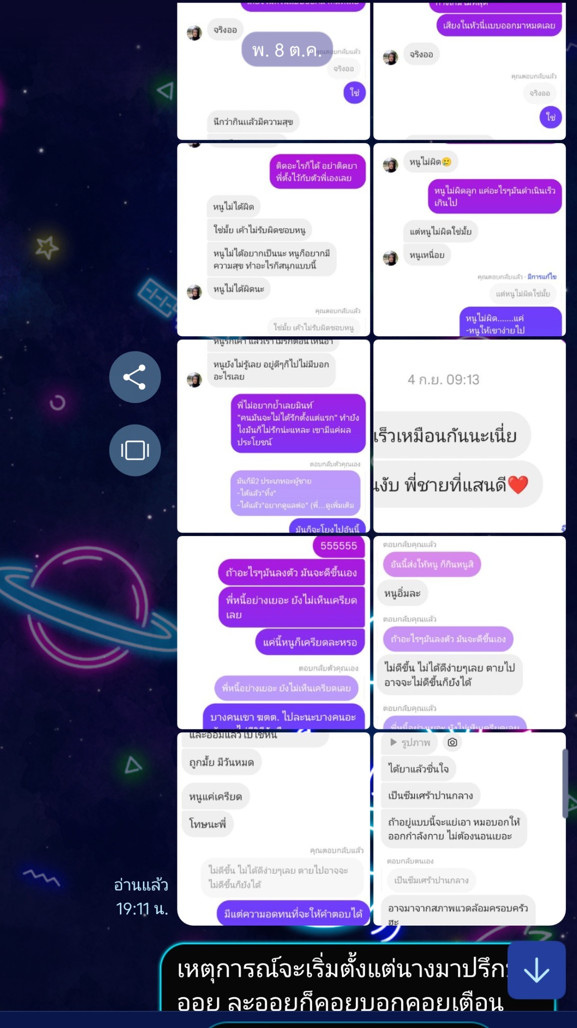 - 8 ตุลาคม 68 เป็นช่วงที่แฟนผมเล่าเรื่องรุ่นพี่ที่พาไปเที่ยว (เล่าไว้ช่วงท้ายEP1) ตอนช่วงนั้นน้องมันบอกผมว่า " เอ่อ หนูดีขึ้นเยอะละนะ เพราะพี่เลย" "หนูชอบพี่ อยากอยู่กับพี่" ในตอนนั้นคิดอะไรไม่รู้ผมอยากเล่าเรื่องนี้ให้แฟนผมฟังเพราะรู้สึกมันจะเป็นรัก3เศร้า เพราะน้องมันเริ่มมีความรู้สึกกับผม วันนั้นแฟนผมเล่าจบผมเลยบอกว่ามีอะไรให้ดู ผมจึงแคปแชทที่คุยกับน้องคนนั้นให้ดูว่าน้องมันพูดอะไรกันผมไปบ้าง วันนั้น