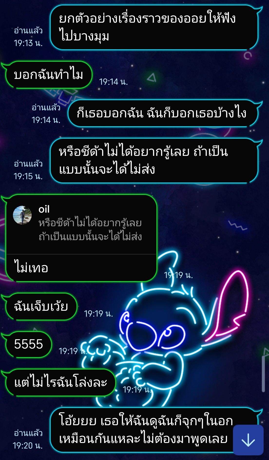 ท้ายสุดผมได้คุยกับพ่อแม่ผม สรุปได้ความว่า "ออย อะหลายใจ ให้ความหวังน้องอีกคน เหยียบเรือ2ลำโดย ลำละ1ข้าง มึนต้องเลือกทิ้งเรือ1ลำ หรือจะโดนลงน้ำโดยทิ้งทั้ง2ลำ กุให้เลือกแค่นี้ " โดยละหว่างคุยผมก็พูดเรื่องแฟนผมที่ไปเที่ยวไปนอน,โดยผู่ชายจะข่มขืน ไปเปิดใจกันคนอื่นไปด้วย