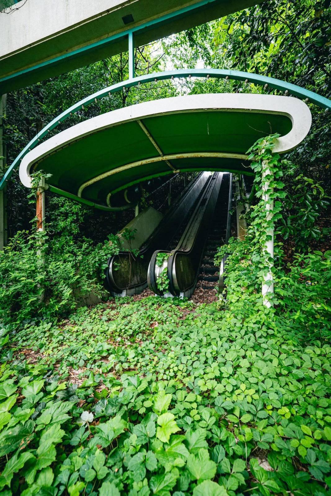 บันไดเลื่อนที่ถูกไม้เลื้อยแทนที่ ภายในสวนสนุกที่ถูกทิ้งร้างในจังหวัดนางาซากิ ประเทศญี่ปุ่น ที่นี่เป็นที่รู้จักทางออนไลน์มาตั้งแต่ปี 2019