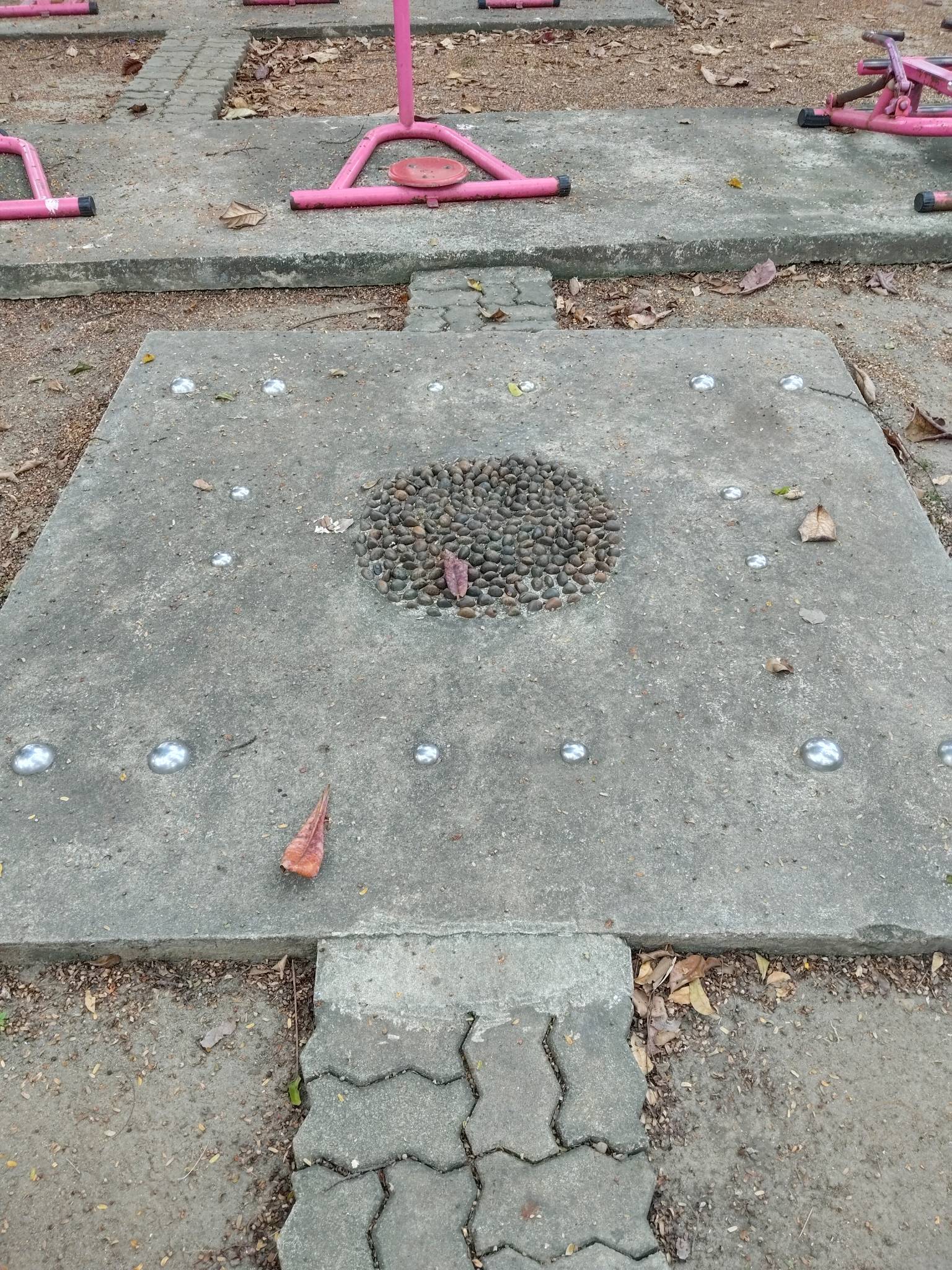 จากภาพด้านล่าง ที่พื้นของสนามกีฬา สนามเด็กเล่น ตามหมู่บ้าน สวนสาธารณะ จะมีบริเวณสี่เหลี่ยม ตรงกลางมีก้อนกรวด รอบ ๆ เหมือนเป็นหมุดเหล็กกลม ๆ หลายอัน