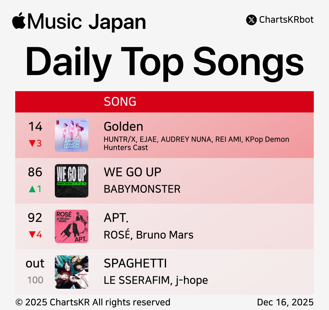 เพลง WE GO UP ของ BABYMONSTER อยู่ในอันดับ 86 บน Apple Music Japan Daily Top Songs Chart เป็นเพลงเดียวจากไอดอลเคป๊อปเจน 5