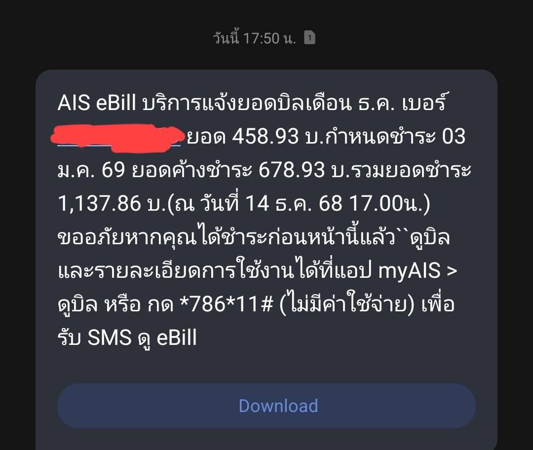ก่อนหน้านี้ใช่ไหมคะ ทาง ais ได้แจ้งเตือนค่าค้างชำระ ของเดือนที่แล้ว เป็นจำนวน678.93 บาท เรางงไปเลยค่ะเพราะคิดว่ารวมกับของเดือนนี้เลยจ่ายไปด้วย เราพลาดตรงที่เผลอลืมของเดือนที่แล้วจริงๆ เพราะมั่วยุ่งกับเรื่องมหาลัย เราเลยชำระในตอนเช้าของวันที่15 ธันวา พอมาวันนี้ ทาง ais แจ้งยอดมา เรางงเลยค่ะ เราชำระไปเรียบร้อยเลยย้อนไปดูใน myaisเพื่อเช็ค แต่พอขอดูบิลล่าสุด กลับดูไม่ได้เลย ขอไปทาง sms ส่งเป็นไฟล์มาก็เปิดไม่ได้ เราควรเปลี่ยนค่ายดีไหมคะ เพราะเป็นครั้งแรกที่เกิดเหตุการณ์แบบนี้กับเราค่ะ ค่ายais ดีมากจริงๆ แต่ถ้าต้องจ่ายแบบนี้บ่อยๆ คงไม่ไหวค่ะ เพราะเราพึ่ง18เอง