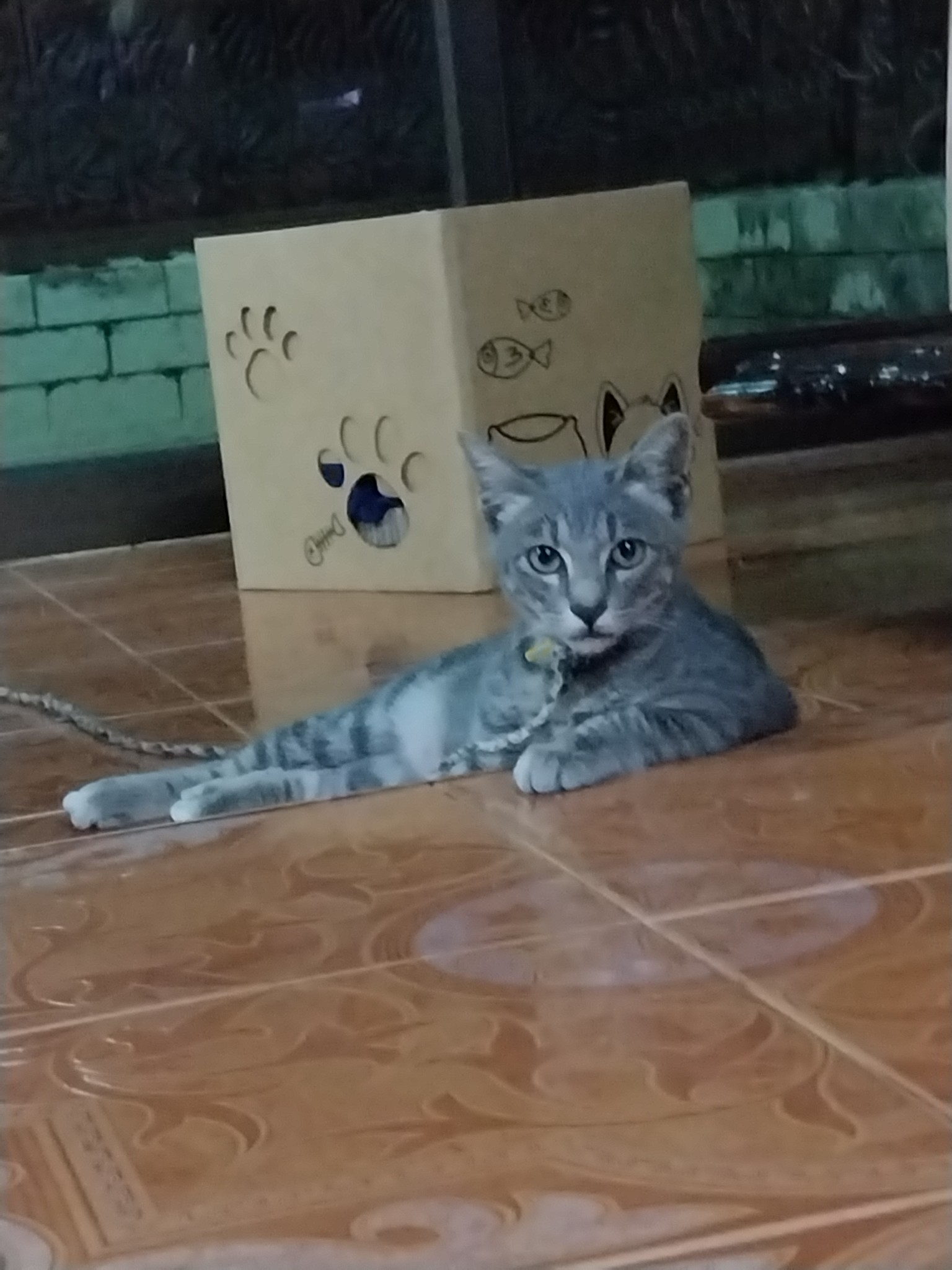 ตอนนี้มีแมวอายุประมาณ3เดือนครึ่ง เป็นแมวตัวแรก ยังไม่ได้พาไปหาหมอหรือฉีดยาเลยค่ะ (เพราะที่บ้านไม่ค่อยว่างกัน แต่ก็พยายามหมั่นเช็คตลอดว่ามีอาการของโรคอะไรมั้ย) ที่บ้านเป็นร้านอาหารเลี้ยงไว้ไม่ได้ลยต้องเอาไปอยู่กับคุณยายค่ะ บ้านยายตอนเช้าเปิดทุกอย่างทั้งประตูและหน้าต่างเลยค่ะ ถึงจะมีกรงกั้นแต่ก็เข้าออกทางไหนก็ได้อยู่ตลอด ตอนนี้ผูกน้องไว้กับเสาหน้าบ้านในตอนเช้า ตอนเย็นผูกไว้กับประตูหน้าบ้านค่ะ ให้เข้ามานอนข้างในได้ แต่ก็จำกัดพื้นที่ ถึงน้องจะมีกระบะทรายพร้อม มีของเล่นให้ มีข้าวกิน3มื้อต่อวัน แต่ก็ยังไม่รู้สึกดีกับการเลี้ยงแบบนี้เลยค่ะTTT กลัวน้องก้าวร้าวแล้วก็เครียด แต่เราก็พยายามใช้เวลากับน้องเยอะๆนะคะ ทั้งเล่ยของเล่น ทั้งพยายามพาออกไปเดินให้ได้ใช้แรง โดยส่วนตัวคุณยายไม่ได้ชอบแมวอยู่แล้ว และก็อายุมากค่ะ จึงไม่ได้ค่อยเล่นหรืออะไรกับมันมากนอกจากให้ข้าวค่ะ แล้วน้องก็เคยวิ่งเล่นไปทั่วจนทำแก้วหล่นแตกค่ะ พลังเยอะมาก ทั้งวิ่งทั้งกัด กลัวปล่อยแล้วจะเอาตัวรอดเองไม่ได้ แล้วก็บ้านจะเละะ