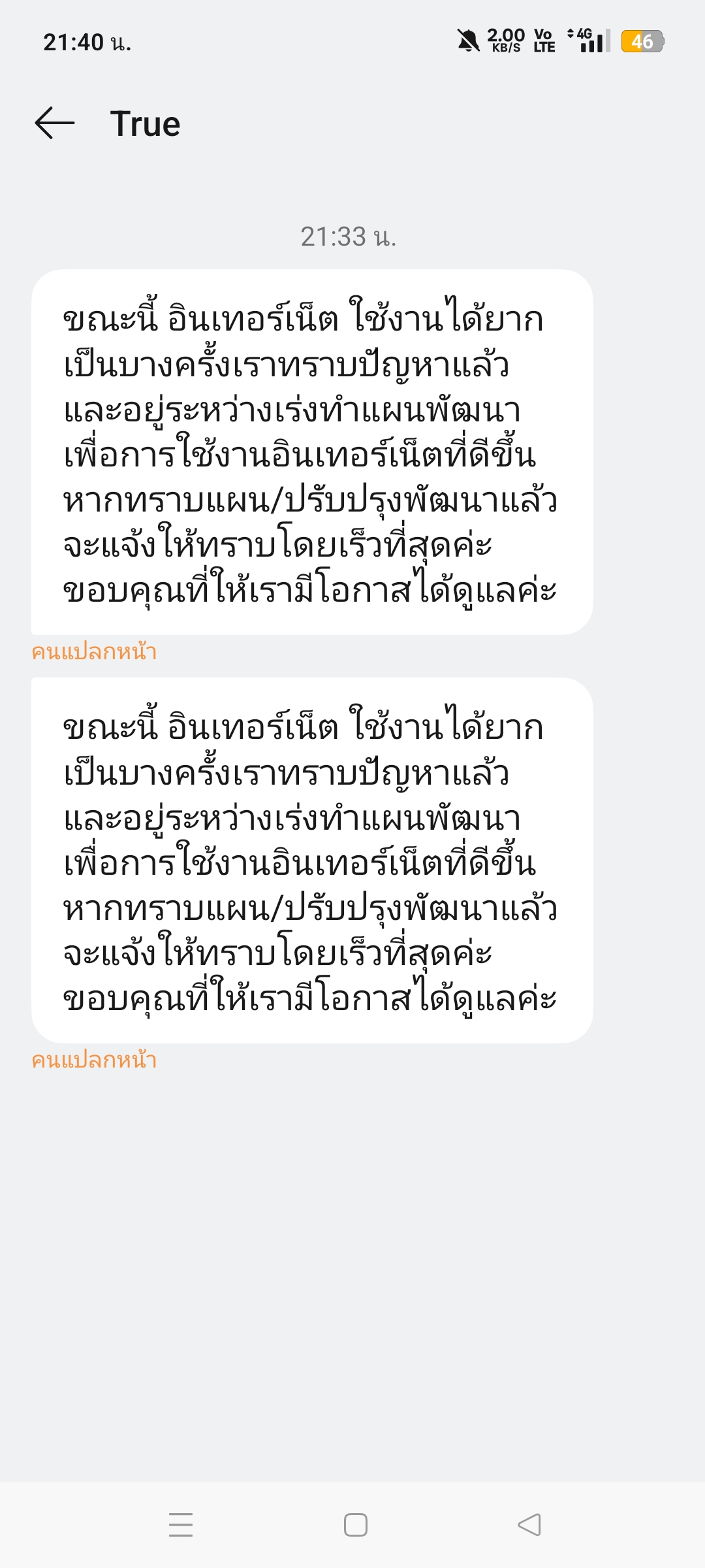 ทรูส่งข้อคามแบบนี้มา..แร้วจะช่วยให้แน็ตดีขึ้นมั้ยคับ....ผมรู้แร้วว่าแน็ตคุนใช่การไม่ด้าย...ที่ถาม...ไม่ใช่ส่งมาย้ำเตือน....ถ้าคุนส่งมาแร้วแน็ตดี....อันนี้ก้อเรื่องดี...