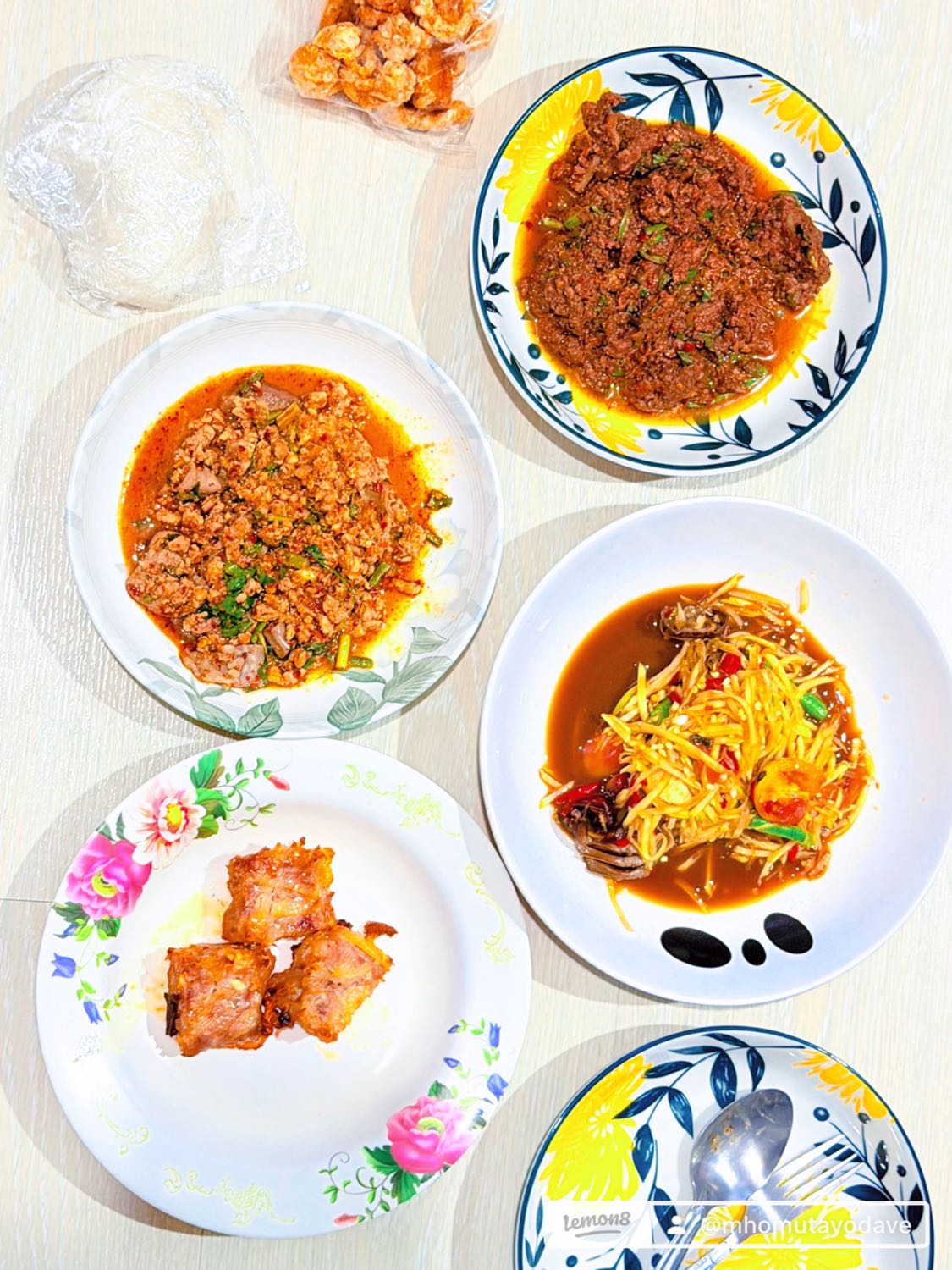 ลาบหมู ส้มตำไทย ตำข้าวโพด และ หมูย่างจิ้มแจ่ว สั่งมาอย่างละจาน ไม่ใส่พริก แบบนี้ก็อร่อยนะ แซ่บได้โดยไม่ใส่พริก มีหมูย่างจิ้มแจ่วที่ใส่พริกป่นมาหน่อย ก็ไม่จิ้มละกัน รสชาติดี พี่คนตำส้มยำยังแซว