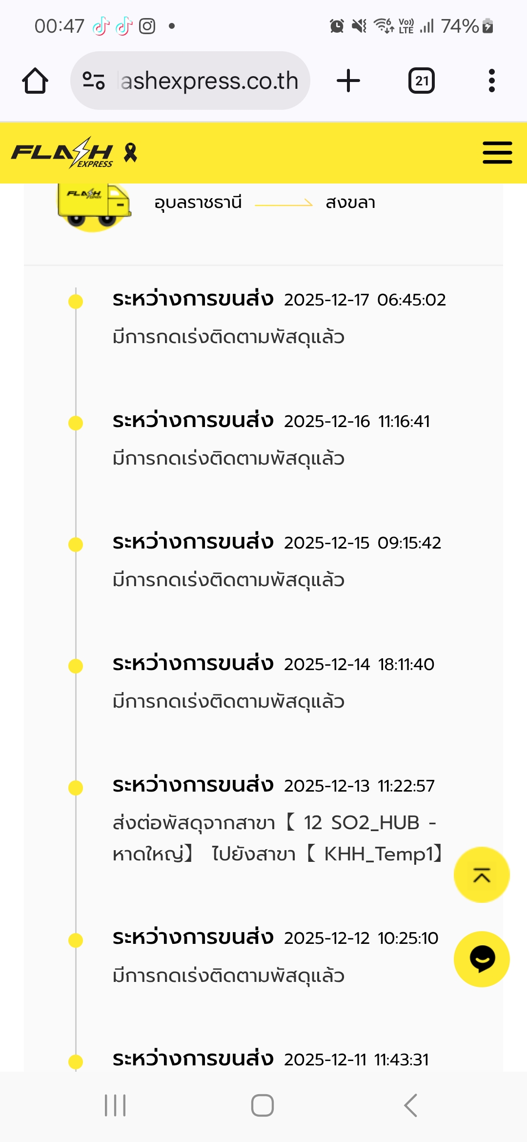 Flash สาขา12 SO2_HUB-หาดใหญ่ทำไมไม่มีการอัพเดทอะไรเลย โทรไปก็ไม่รับ เงียบหายทักไปสอบถามก็เงียบตอบกลับมาแค่ข้อความอัตโนมัติ ไม่มีเจ้าหน้าที่ตอบกลับมาเลย เร่งนำส่งไปแล้วก็ยังไม่มีอะไรอัพเดทความคืบหน้ามา