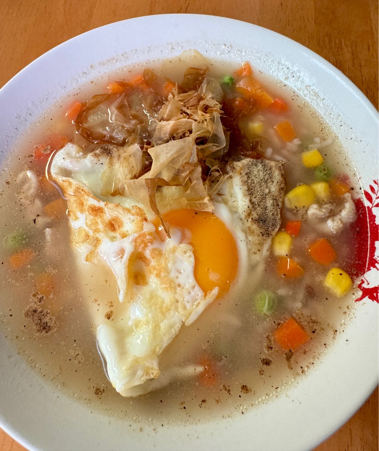 ข้าวเย็นเหลือครึ่งหม้อ ทำยังไงให้พอกิน4 คน ก็เพิ่มจำนวนเอาด้วยการต้ม ใส่เหมือนเดิม หมึกแห้ง กุ้งแห้ง อกไก่บด+หมูบด แครอทนิด เพิ่มไข่ต้มจะได้โปรตีนครบๆ ส่วนมันฝรั่งทอดเหลือจากกินที่ร้านเมื่อวานที่เด