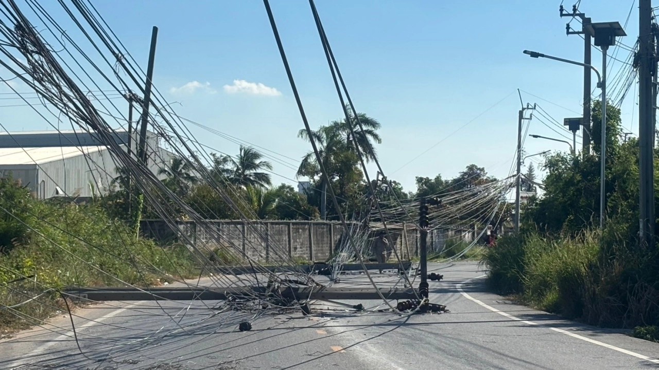 สาวขับรถบรรทุก พุ่งชนเสาไฟฟ้าข้างทางล้มระนาว ทำรถติดยาวหลายกิโลเมตร ใช้เวลานานกว่า 3 ชั่วโมงจึงเปิดเส้นทางได้ตามปกติ