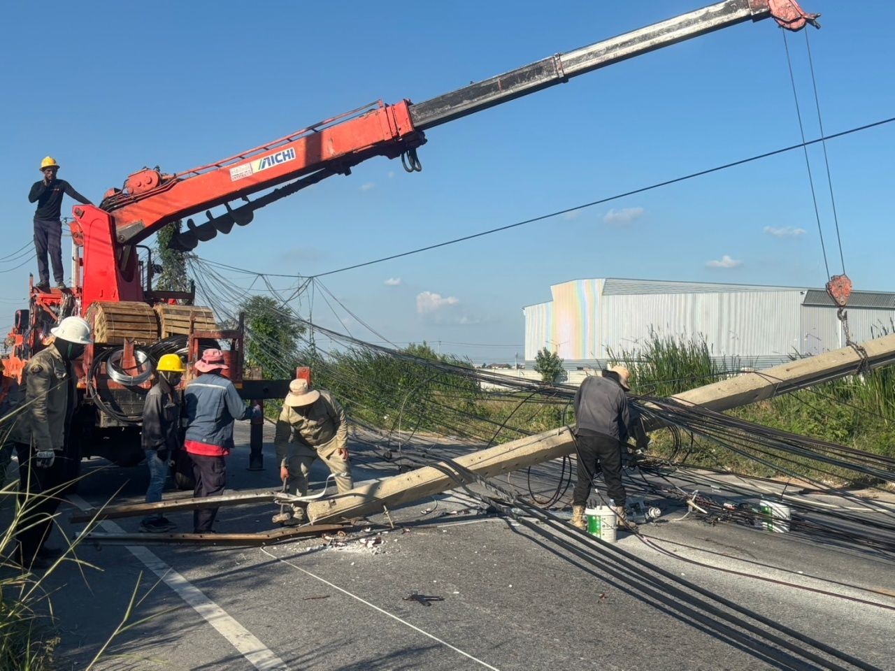 ทั้งนี้ ทางเจ้าหน้าที่การไฟฟ้าต้องรีบตัดกระแสไฟทันที เพราะเกรงว่าประชาชนที่ขับขี่รถจักรยานยนต์ผ่านไปมา อาจเสี่ยงต่อการถูกไฟดูดได้ จึงรีบระดมกำลังเข้าเคลียร์พื้นที่ เร่งเอาเสาไฟฟ้าออกจากถนนเพื่อเปิดการจราจรให้กลับมาใช้ได้ตามปกติ