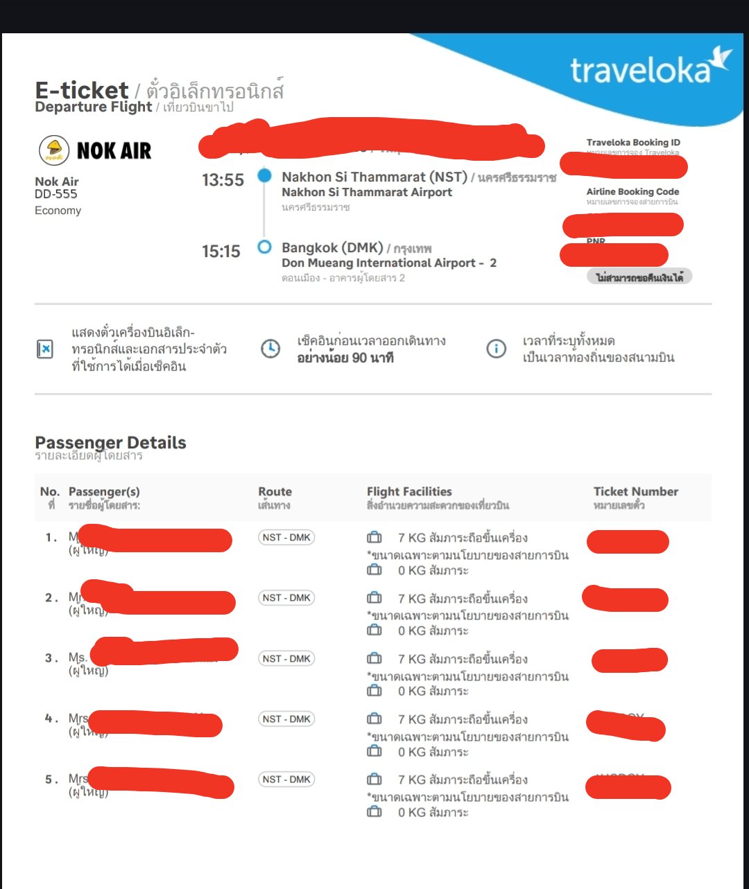เราทำการจองเที่ยวบินเฉพาะขาไปล่วงหน้าประมาณเกือบๆสองเดือน มีผู้โดยสาร5คน เป็นผู้ใหญ่ทั้งหมด ทำการจองจากแอพจองเที่ยว และจ่ายเงินเรียบร้อยแล้ว แต่มีเหตสุดวิสัยเกิดขึ้น มี1คนได้สามารถเดินทางในครั้งนี้ได้