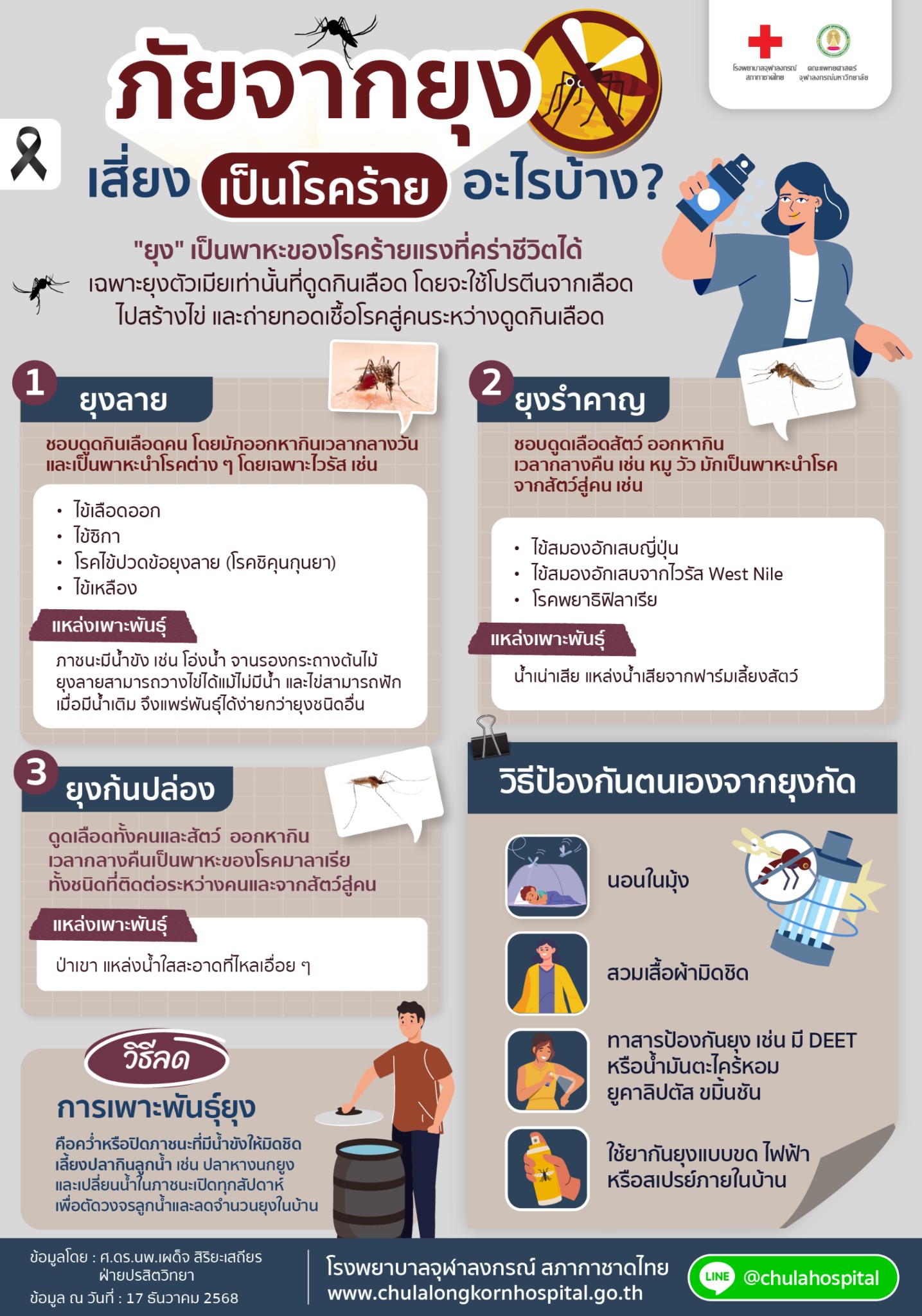 “ยุง” เป็นพาหะของโรคร้ายแรงที่คร่าชีวิตได้ เฉพาะยุงตัวเมียเท่านั้นที่ดูดกินเลือด โดยจะใช้โปรตีนจากเลือดไปสร้างไข่ และถ่ายทอดเชื้อโรคสู่คนระหว่างดูดกินเลือด