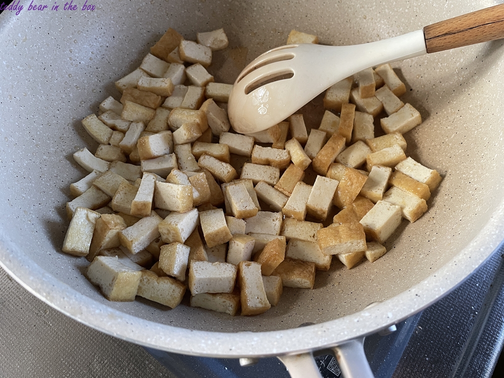 เต้าหู้ หั่นชิ้นเล็ก ทอดให้พอเหลือง