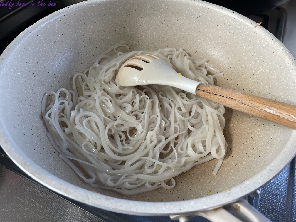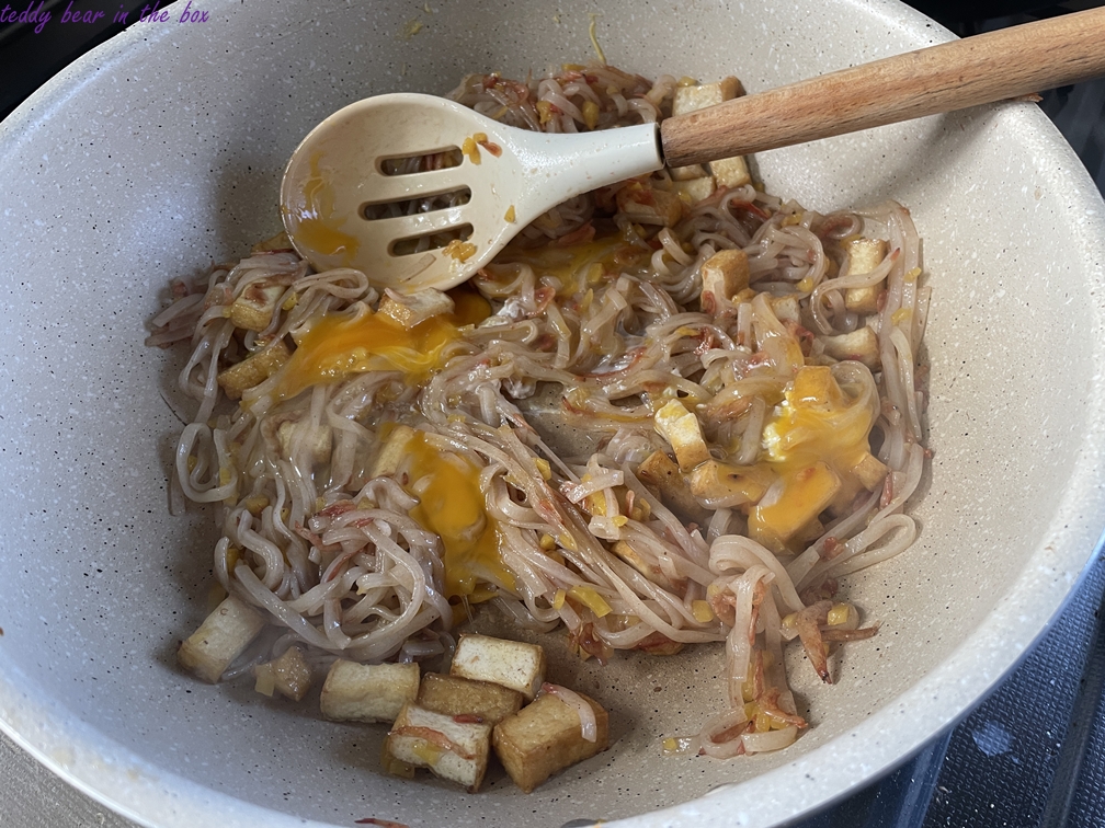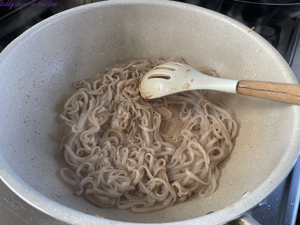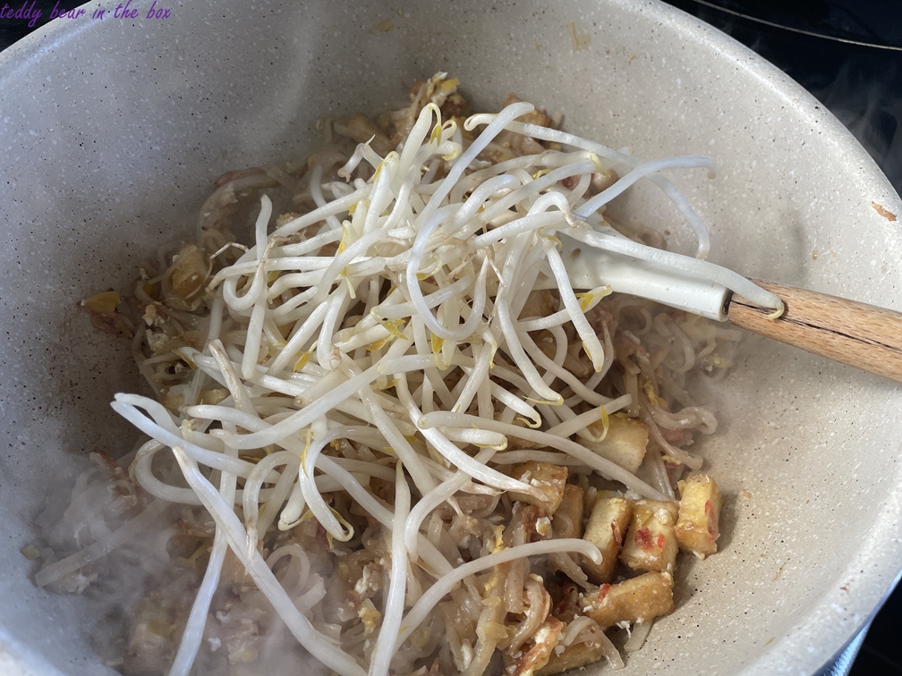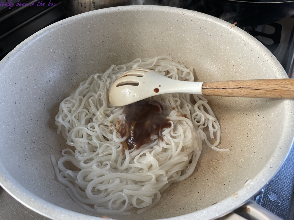ใส่เส้นผัดให้น้ำมันเคลือบเส้น ใส่น้ำดื่มลงไป กวนเส้นให้นิ่ม