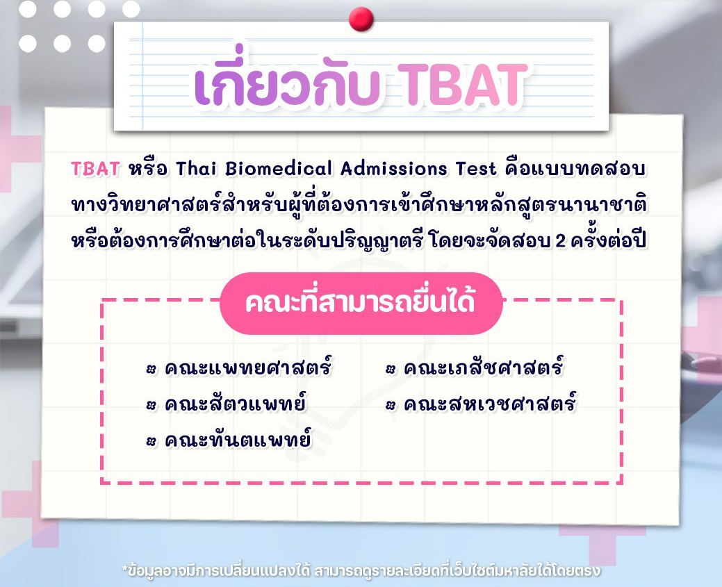 TBAT (Thai Biomedical Admissions Test) คืออะไร? TBAT คือการทดสอบทางวิทยาศาสตร์ที่สำคัญมาก! สำหรับผู้ที่ต้องการเข้าศึกษาต่อหลักสูตรนานาชาติในระดับปริญญาตรี (สายแพทย์) โดยเฉพาะ! ข้อสอบจะจัดขึ้น 2 ครั้งต่อปี เตรียมตัวให้พร้อม!