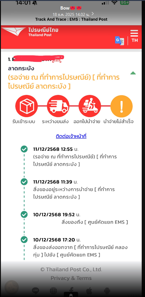 ไปรษณีย์ไทยส่งของไม่สำเร็จครับ