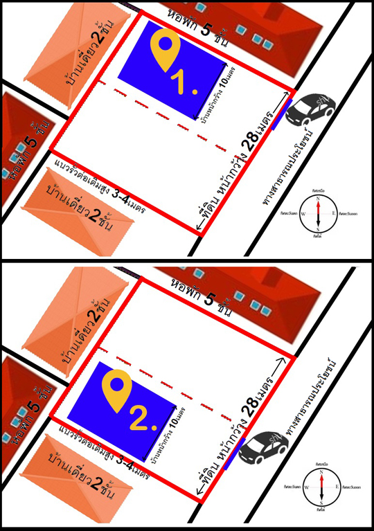 ควรจะปลูกบ้านตำแหน่ง 1.) หรือ 2.) จะเหมาะกว่ากัน