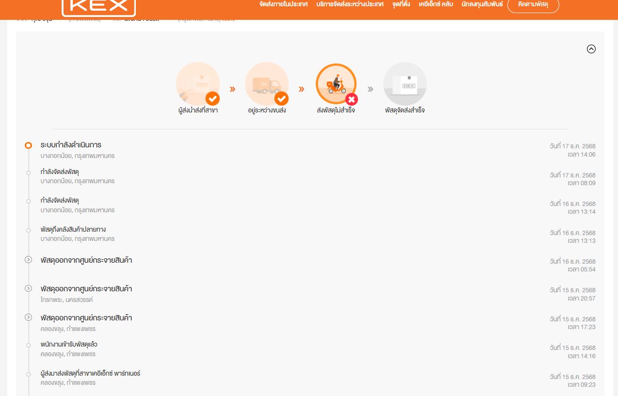 เราจัดส่งสินค้าผ่านช่องทาง kex ตั้งแต่วันที่13/12/68 เมื่อวานได้โทรตามร้องเรียน call center แจ้งเบอร์โทรที่ถูกต้องตามกล่องพัสดุแล้วก็ยืนยันว่าจะส่งให้ในวันรุ่งขึ้นคือวันนี้ 18/12/68 แต่ทางปลายทางก็ยัง