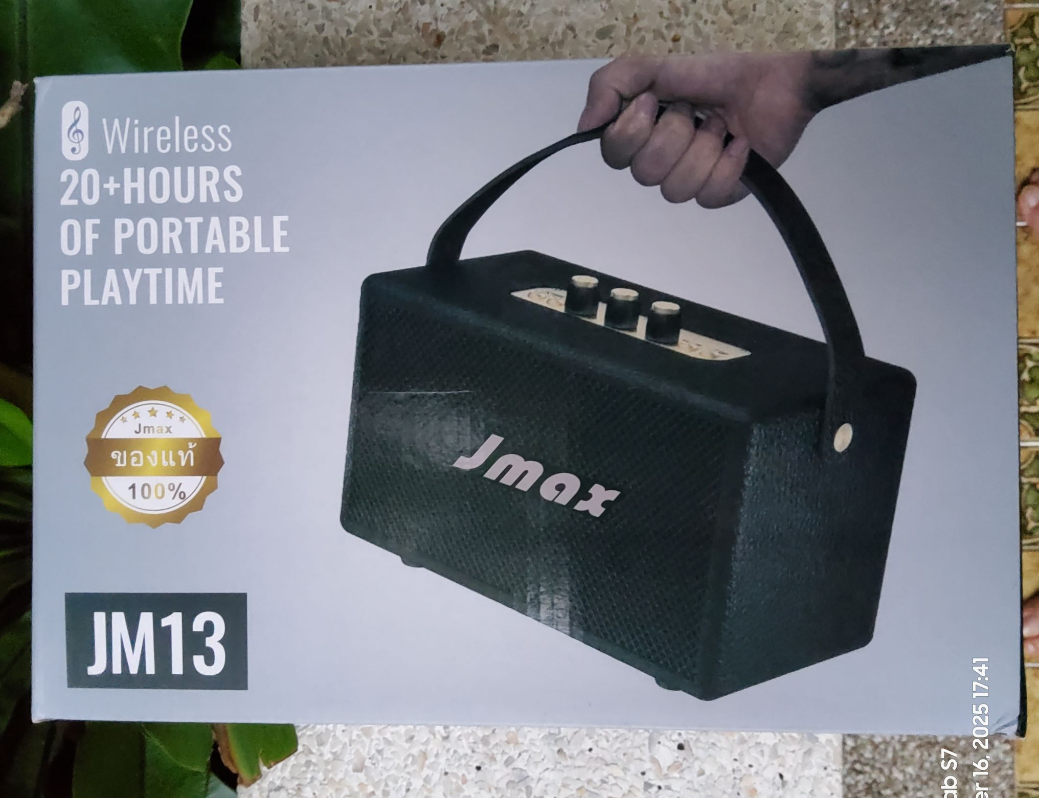 5. จัดหาซื้อลำโพงบลูทูธใหม่ ไปเจอร้าน JPhone มีสินค้าลำโพง JMAX หลากหลายรุ่น ของแท้ ราคาตามขนาดและพลังเสียง เลือกรุ่น JMAX JM13 ราคาโปร 686 บาท ได้คูปองลดจาก mid month และเหรียญลด สุทธิ 438 บาท ครั้งนี้ ไม่โชคร้ายเหมือนครั้งแรก สินค้าตรงสเปค มีกล่องเขียนภาษาไทย ขนาดตู้ลำโพง และ ปุ่มหมุน เหมือนในประกาศ พลังเสียง 12Wx2 ปรับหมุนเสียงแหลม เสียงเบสได้บ้าง สมราคา (มีภาพประกอบ) ทดลองเล่นเพลงจาก microSDcard ต่อเนื่อง เช้า 06:00-21:00 แล้วค่อยมาชาร์จแบต ตอนนอนแบบเดียวกับชาร์จมือถือ