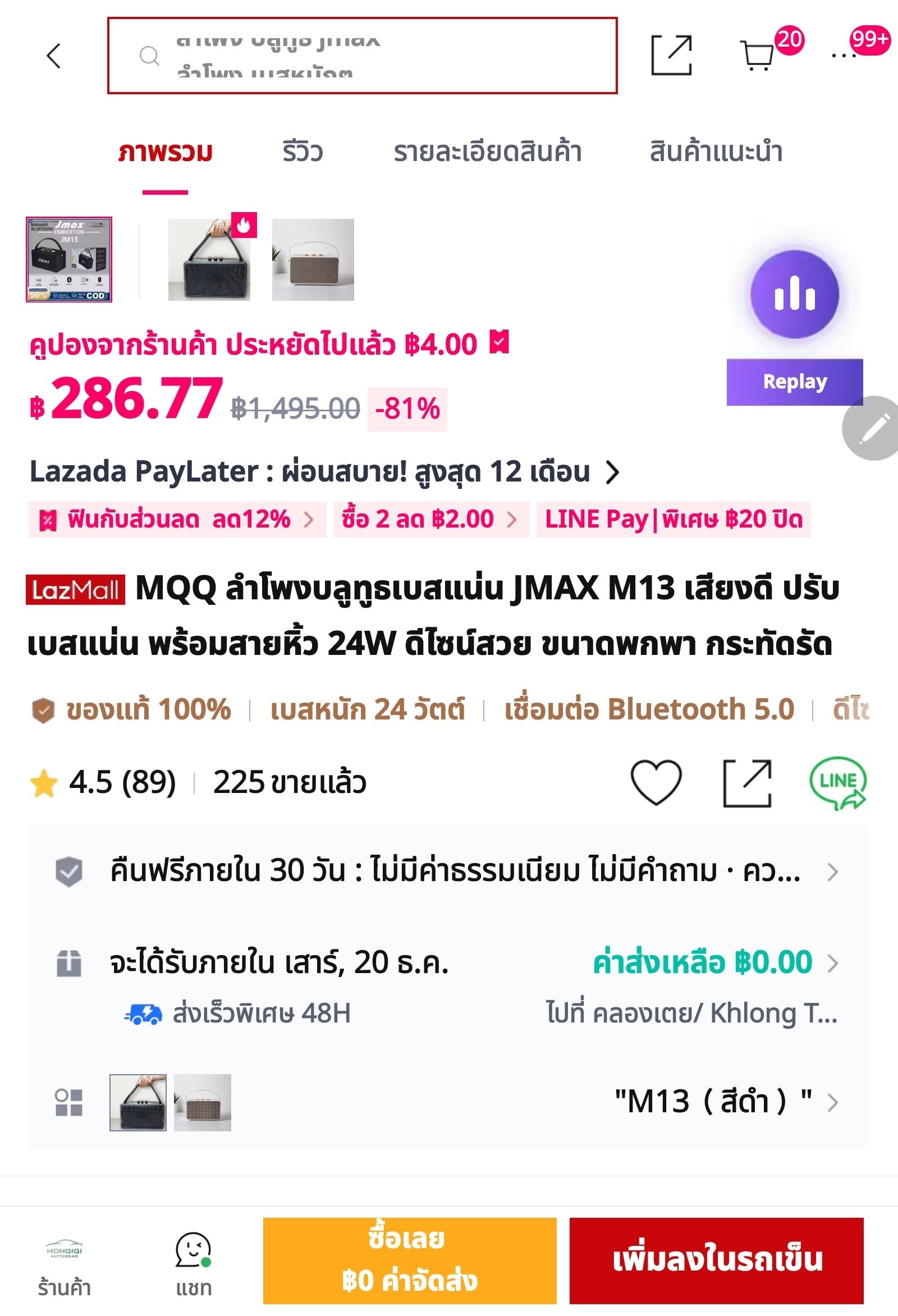 1. ไปเจอร้านระดับ LazMall จีนมาเปิดในไทย ลงภาพคลิปสินค้าเป็นรุ่น Jmax M13 ราคาโปร 12.12 280 บาท หัวคำประกาศเป็น "MQQ ลำโพงบลูทูธเบสแน่น JMAX M13..."