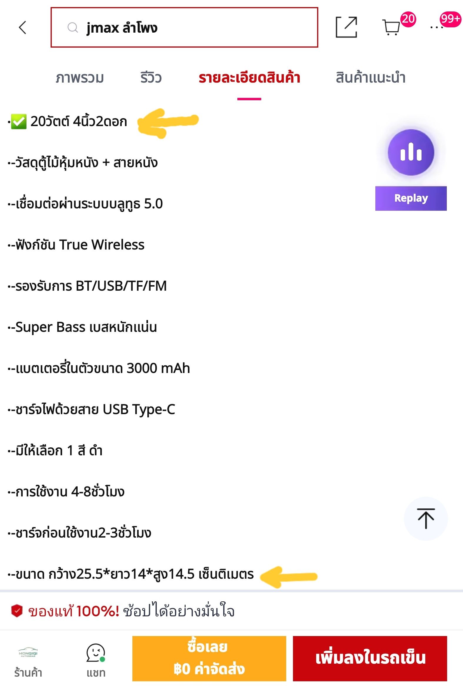 2. รับสินค้ามา ถ่ายรูปหน้าใบนำส่ง ถ่ายคลิปตอนเปิดกล่องแบบต่อเนื่องไม่ตัดต่อ สินค้าไม่ตรงกับรายละเอียดสินค้า คือขนาดจริง 16x9x8 ซม เล็ก ขนาดในประกาศ 26x15x14.5 ซม. ใหญ่กว่า, เอกสารในกล่องแจ้งลำโพง 5Wx2 แต่ประกาศสินค้าบอก 20 วัตต์ 2 ดอก, ปุ่มทำงานเป็นปุ่มกด ไม่หมุน แต่คลิป ภาพสินค้าในประกาศเป็นปุ่มหมุน เพียงเท่านี้ก็เพียงพอว่าเป็นสินค้าไม่ตรงสเปค (มีภาพประกอบ)