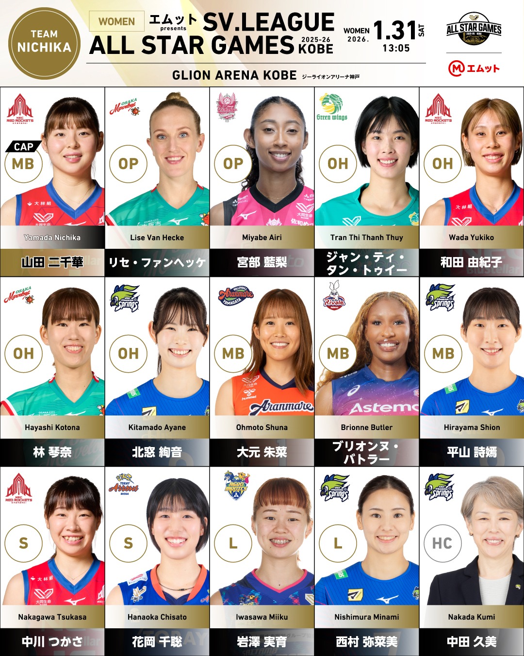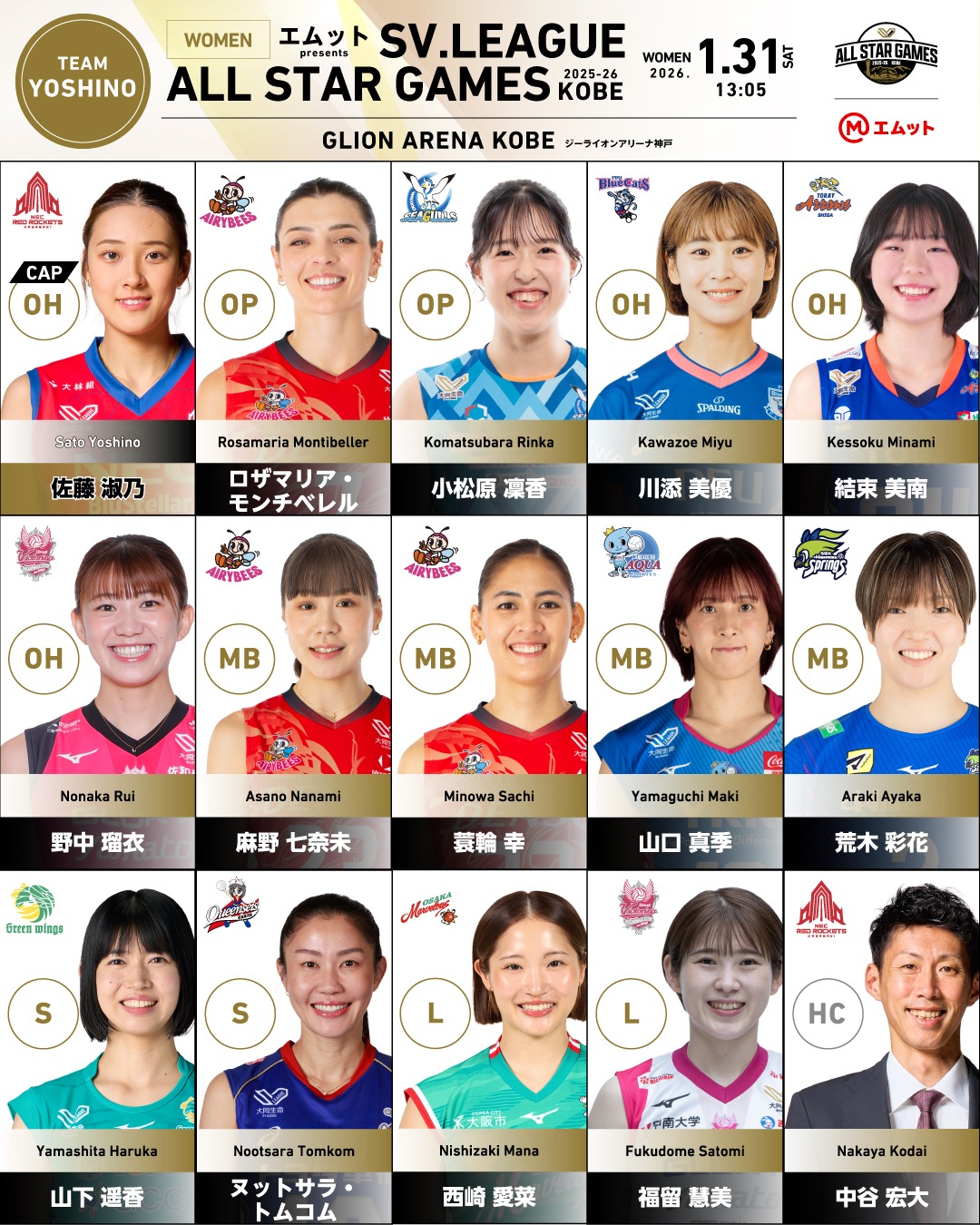 ประกาศรายชื่อนักกีฬาร่วมเล่นแมตซ์ All star ⭐️ ในวันที่ 31 มกราคม 2026 🏟️ GLION ARENA KOBE *** ด้านบนสีทอง 💛 นักกีฬาได้รับเลือกจากคะแนนโหวตในแอปVコレ และทางเว็บของJSPORT *** ด้านล่างสีเงิน 🩶 นักกีฬาได