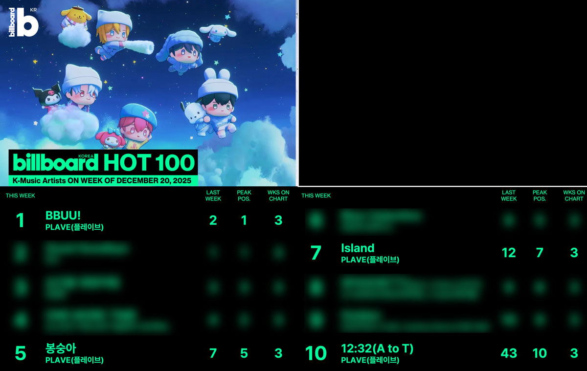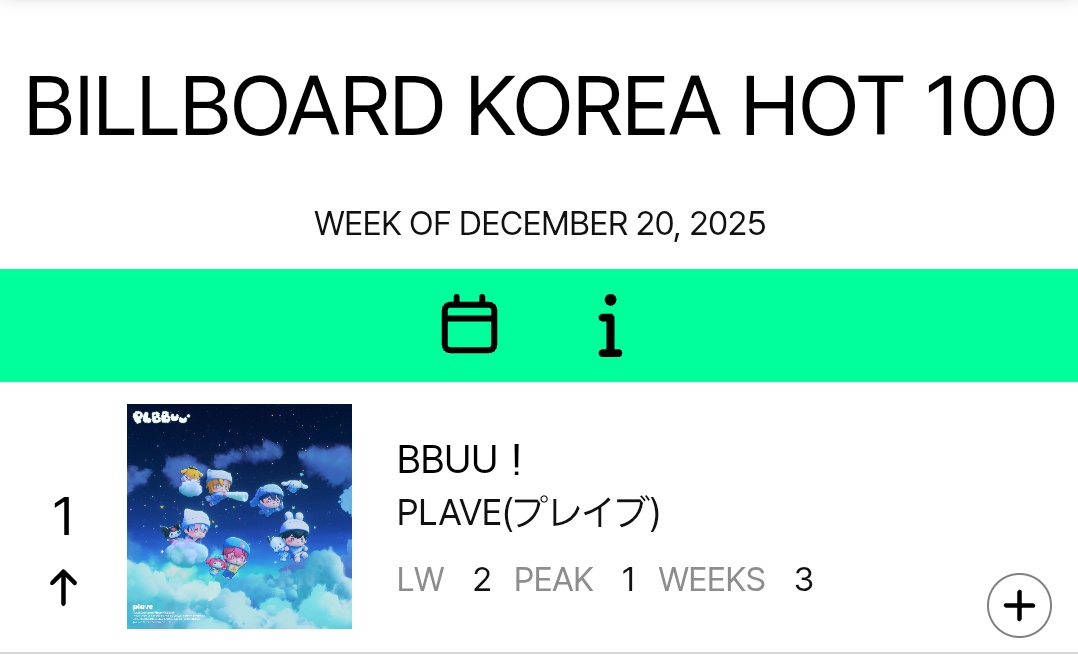 อัเพลง "BBUU!" ของ PLAVE ซึ่งอยู่อันดับ 2 เมื่อสัปดาห์ที่แล้ว ขึ้นมาครองอันดับ 1 ของ Billboard Korea HOT 100