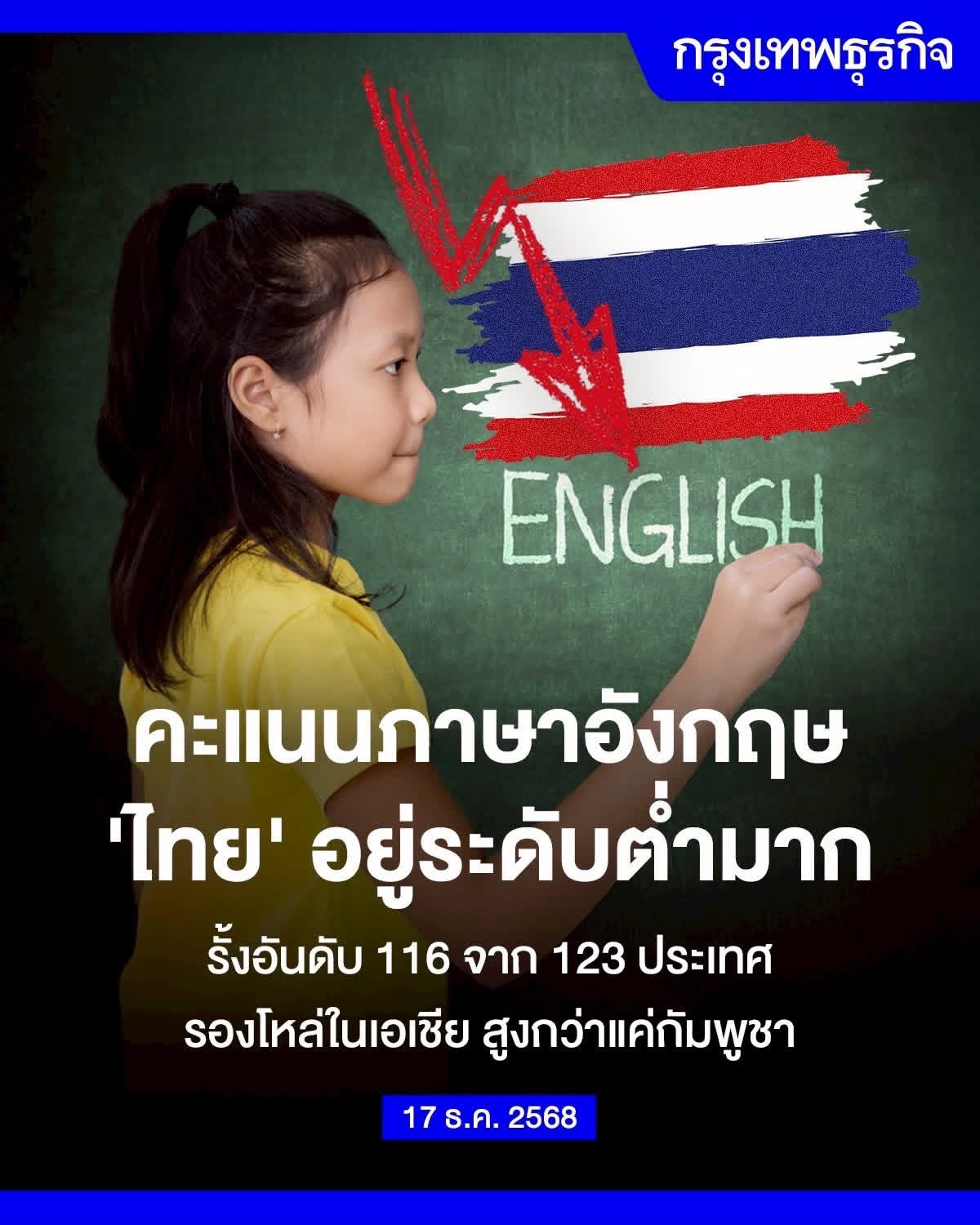 รายงาน EF EPI ประจำปี 2025 เผย คะแนนภาษาอังกฤษไทยอยู่ระดับต่ำมาก ด้วยคะแนน 402 คะแนน อยู่ในอันดับที่ 116 จาก 123 ประเทศ รั้งอันดับรองสุดท้ายในเอเชีย คะแนนสูงกว่าแค่กัมพูชา