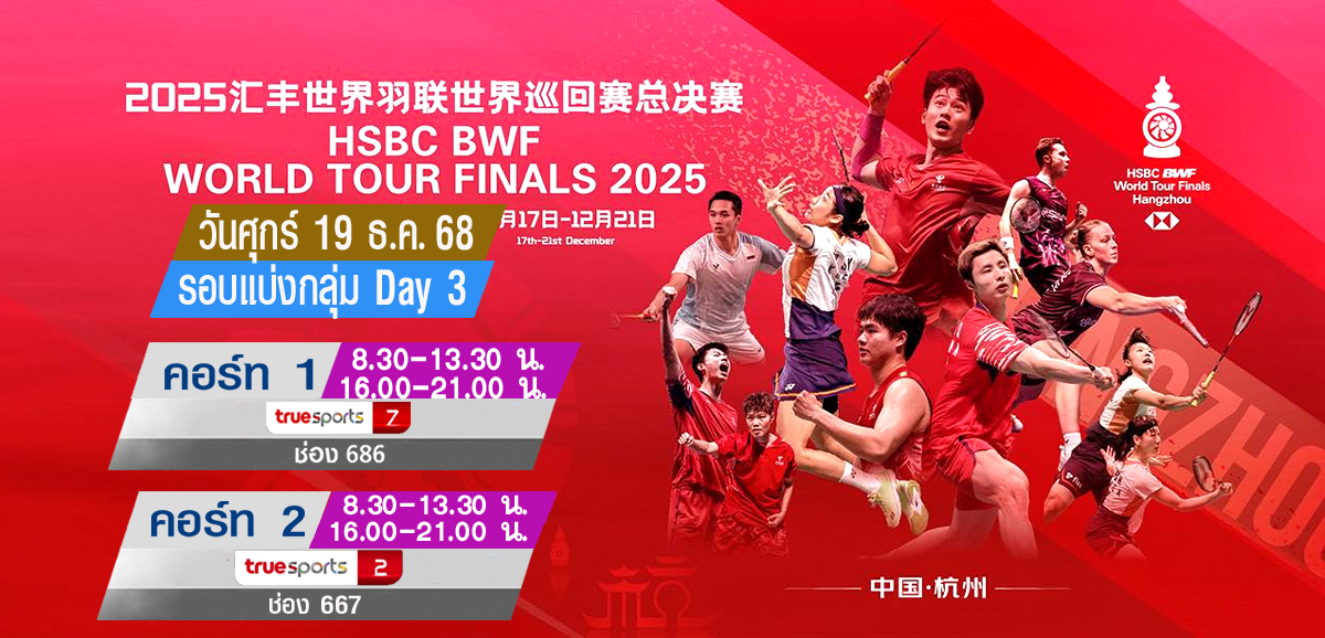 เชียร์สด ! แบดมินตัน HSBC BWF World Tour Finals 2025 : รอบแบ่งกลุ่ม Day 3 (19 ธ.ค. 68) (คู่แรกเวลา 8.30 น.)