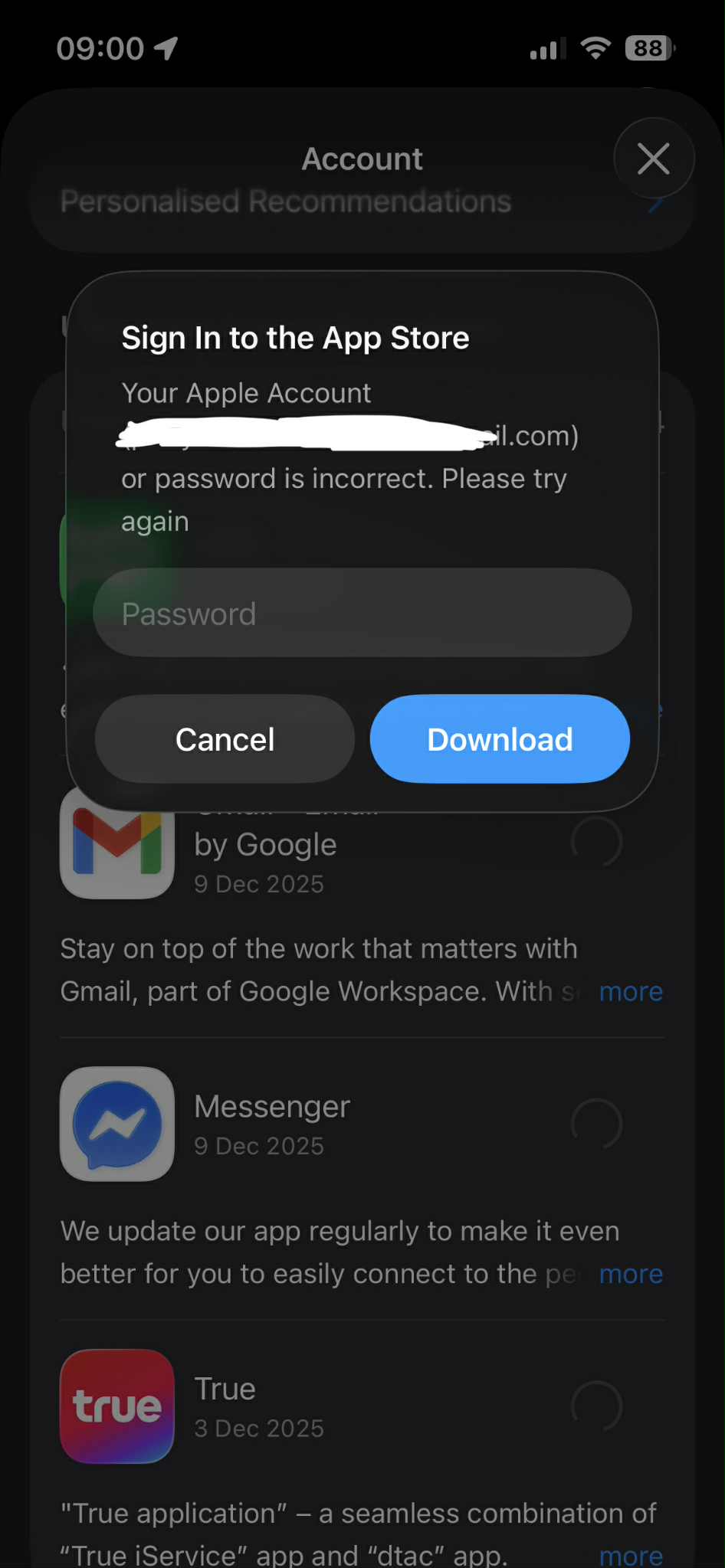 - แต่มันจะมีบางแอปที่เราตั้งค่าให้ไม่อัปเดตอัตโนมัติ พอเราต้องการจะกดอัปเดต มันดันเด้งให้ใส่รหัสของ apple id ที่พนักงานเคยใส่ให้ (ซึ่งเรา log out ไปแล้ว และก็ไม่ได้จำรหัสที่พนักงานตั้งให้ด้วย เพราะทั้งเมลทั้งรหัสเขาตั้งได้ยาวและประหลาดมาก เอาชื่อจริงเราไปตั้งแบบสะกดเองผิด ๆ)