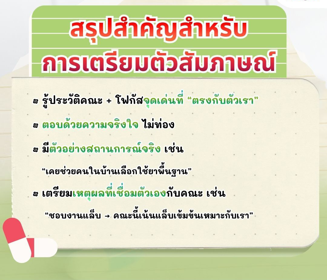 การทำความเข้าใจหัวข้อเหล่านี้ล่วงหน้า จะช่วยให้ผู้สมัครสามารถเรียบเรียงคำตอบได้ชัดเจน สอดคล้องกับแนวทางการประเมิน และแสดงความพร้อมในการก้าวสู่วิชาชีพเภสัชกรได้อย่างเหมาะสม