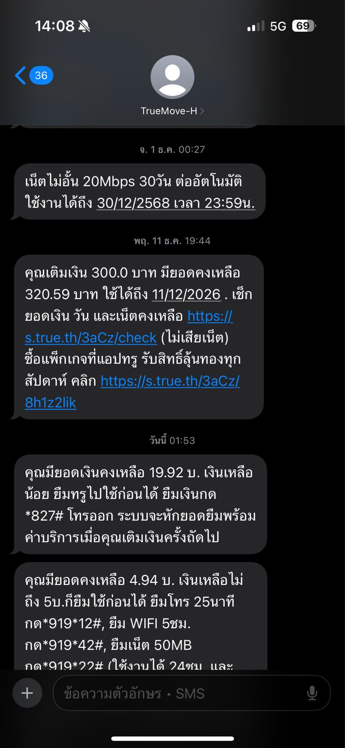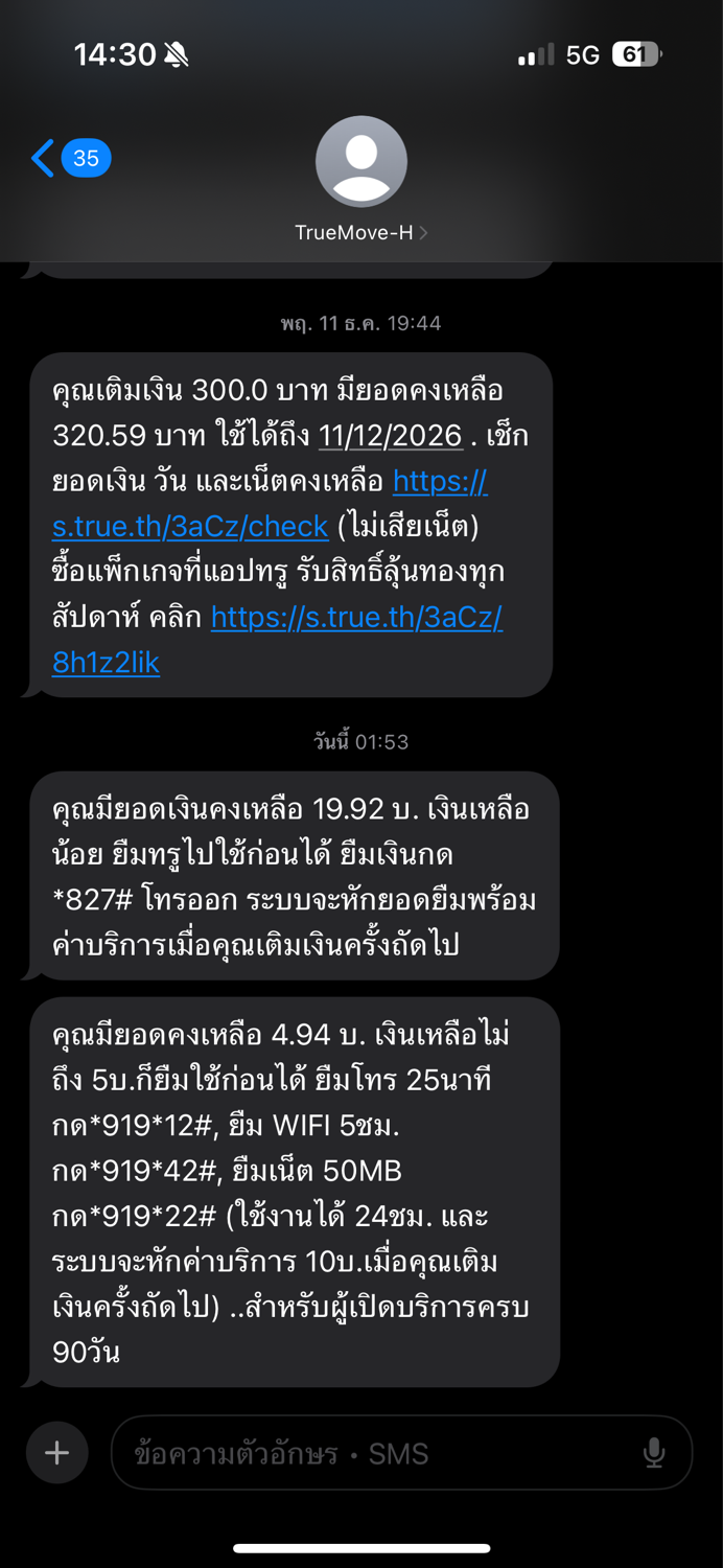วันนี้จะโทรออกอยู่ดีๆบอกยอดเงินไม่พอ พอลองเช็คแจ้งเตือนเงินหมดมาตอนตี 1 กว่า งง ยังไม่ได้ทำอะไร เติมมา 300 วันที่ 11/12/68 ตี1 19/12/68 บอกเงินหมด ลองเติมไปใหม่อีก 320 ดูซิจะหายอีกไหม ประเด็นคือรบอยู่ชายแดน เน็ตก็ห่วยต้องมาปวดหัวเรื่องนี้อีก