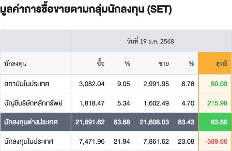 Sinthorn Summary 19/12/2568 : ต่างชาติซื้อสุทธิ 83.60 ลบ.