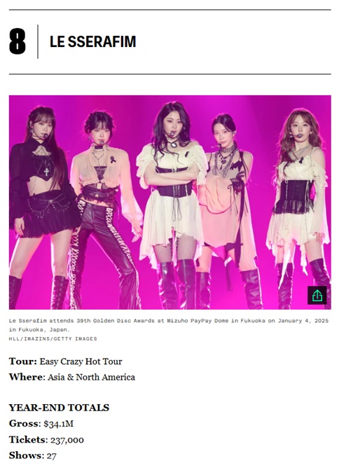 ตอกย้ำความปัง!! LE SSERAFIM ติด Top 10 Highest Grossing K-Pop Tours of the Year 2025 (via BillBoard)