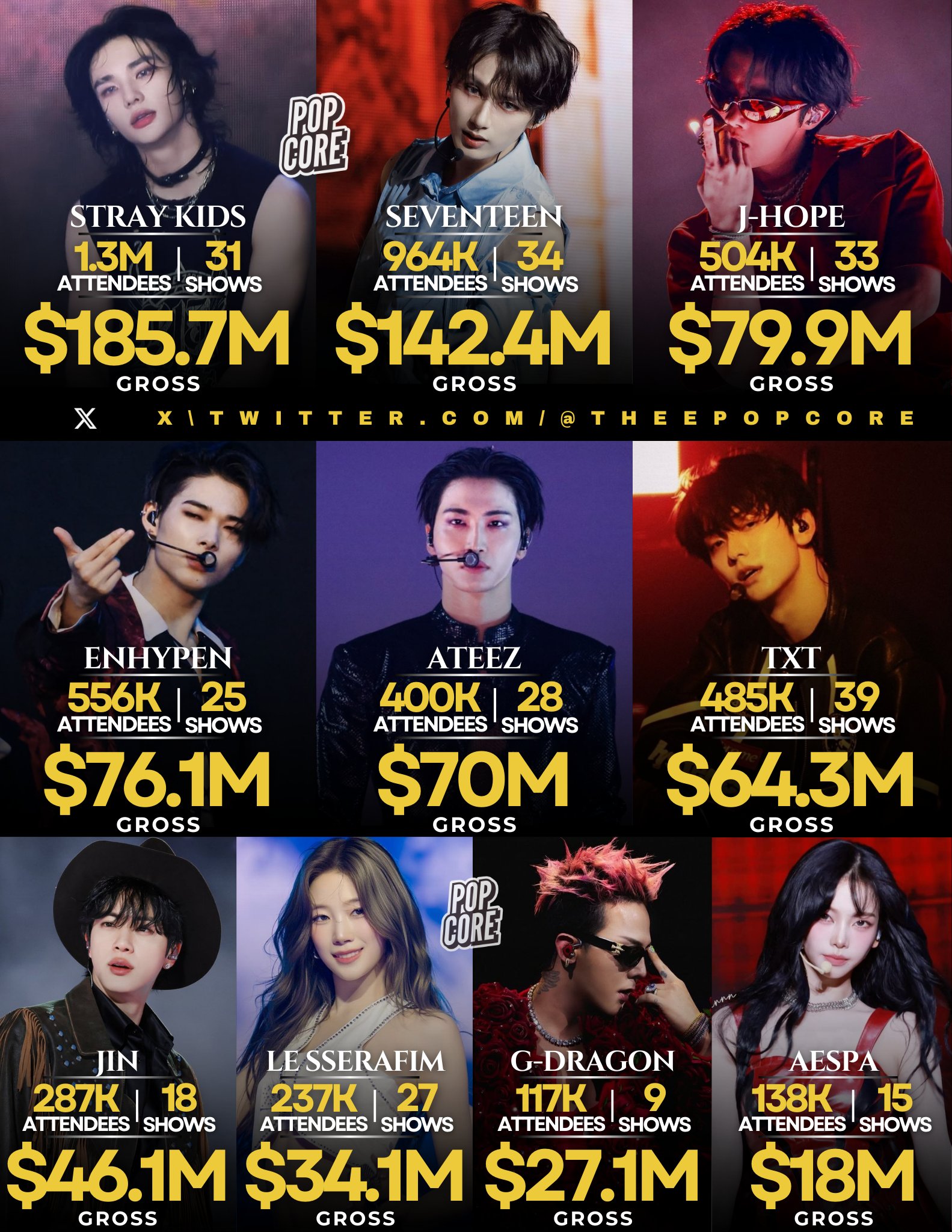 1. Stray Kids ทัวร์ : Dominate World Tour สถานที่ : เอเชีย ยุโรป อเมริกาเหนือและใต้ สถิติรวมสิ้นปี รายได้รวม : 185.7 ล้านดอลลาร์สหรัฐ จำนวนตั๋ว : 1,300,000 ใบ จำนวนการแสดง :