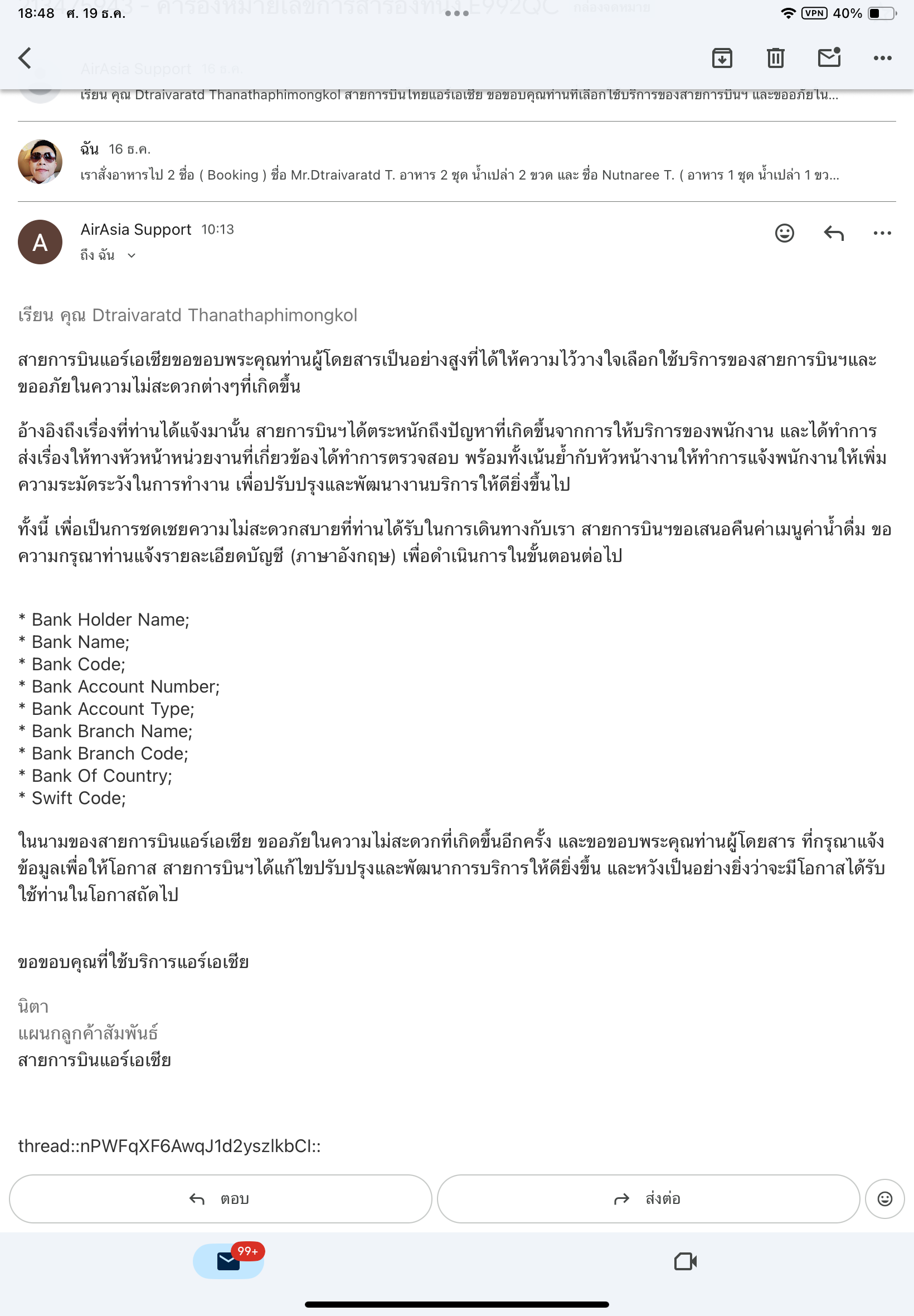 ผมและเด็ก จำนวน 3 คน ได้เดินทางด้วยสายการบินเอเชียจากเชียงใหม่ ไปสุววรณภูมิ ได้สั่งอาหารล่วงหน้าไว้ 3 ชุด พร้อมน้ำ 3 ขวดเนื่องจากไฟล์ทบินถึงประมาณเกือบ 2 ทุ่ม และต้องต่อรถไปศาลายาเพื่อพาเด็กๆ สอบแข่งขันตอนเช้า เลยลองสั่งอาหารบนเครื่องบินครั้งแรกให้เด็กๆ ทานให้อิ่มบนเครื่องบินเลย เครื่องบินขึ้นไปสักพัก สัญญาณจากกัปตันให้สามารถปลดเข็มขัดได้ แอร์โฮสเตสเริ่มเข็นสินค้า อาหารเครื่องดื่มมาขาย 2 คันรถ ผมกับเด็กๆ ก็รอรับอาหารแต่ก็ไม่มาเสิร์ฟ จนพนักงานต้อนรับเครื่องบินขายของเสร็จไปนานแล้วก็ยังไม่ว่าตอนนั้นคิดว่าเขาคงลืม เพราะก่อนขึ้นเครื่องได้ตรวจสอบกับเจ้าหน้าที่ภาคพื้นดินตอนออกตั๋วเรียบร้อยแล้วว่าได้มีการสั่งอาหารและเครื่องดื่มไว้ เครื่องบินบินไปได้น่าจะเกือบครึ่งทาง แอร์โฮสเตสสาวเดินมาบอกว่า ทางเราได้สั่งอาหารไว้ 3 ชุด น้ำ 2 ขวด เราก็โต้แย้งไปว่า ไม่ใช่ สั่ง อย่างละ 3 พยายามเปิดมือถือโชว์หลักฐานการสั่งในระบบ แต่ไม่มีสัญญาเนตเลยเปิดไม่ได้ สรุปได้น้ำมา 2 ขวด ต้องซื้อเพิ่ม 1 ขวด ราคา 40 บาท และต้องรีบรับประทานอาหารอย่างรวดเร็วที่สุดเพราะกลัวเครื่องบินจะลงก่อน ทานเสร็จพอดี ประกาศรัดเข็มขัด พร้อมเอาเครื่องลงสนามบินสุวรรณสุวรรณภูมิ กลับมาถึงเชียงใหม่ จึงได้เขาไปตรวจสอบการรสั่งอาหารในระบบอีกครั้ง และพบว่า ตนเองสั่งถูกต้องทุกประการ เลยได้ทำเรื่องร้องเรียนไปที่แอร์เอเชีย และมีอีเมล์ตอบกลับมาแบบนี้ คิดว่าเป็นประสบการณ์ที่แย่มากๆ และคงเป็นครั้งสุดท้ายกับสายการบินนี้ เพื่อนๆ มีประสบการณ์แบบนี้บ้างไหม